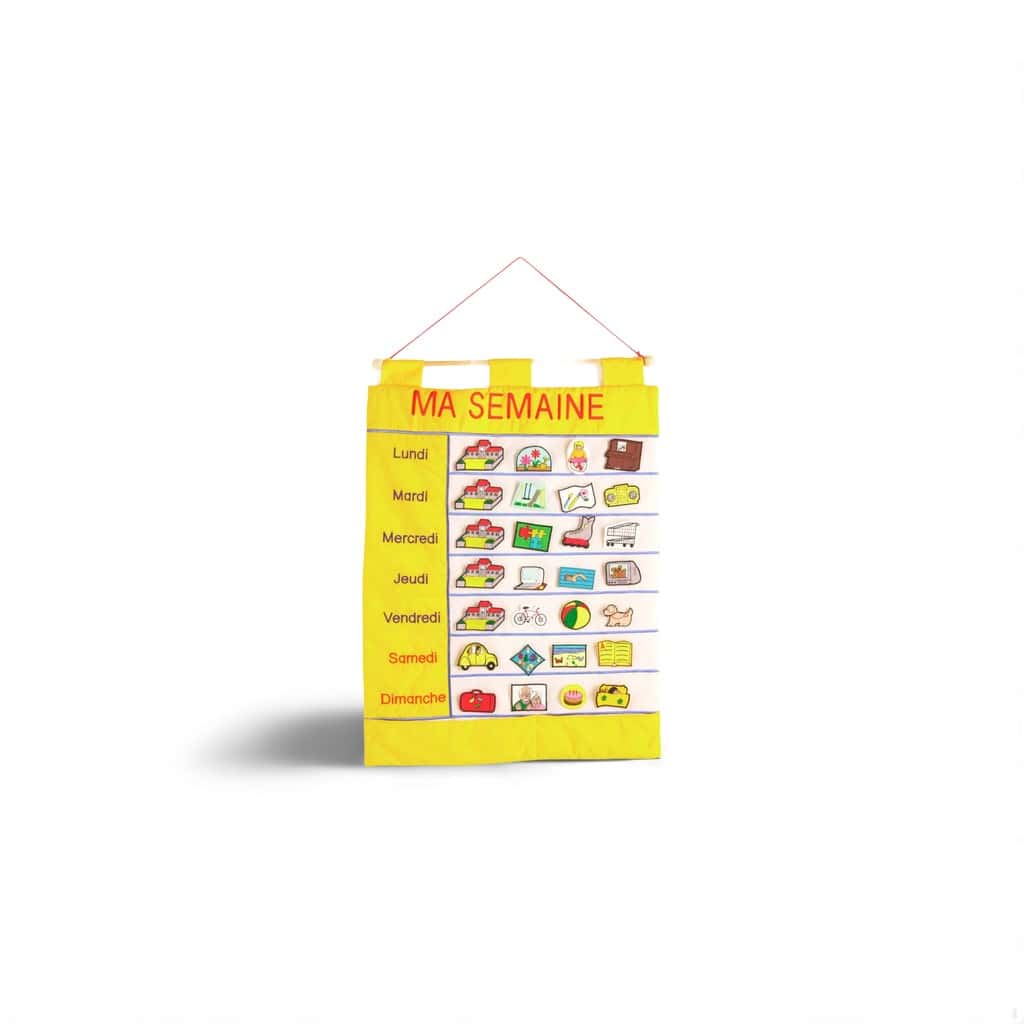 نسخة فرنسية مخطط نسيج تفاعلي ممتع يعرض أيام الأسبوع السبعة ويتضمن 28 قطعة قابلة للتعليق يمكنك وضعها في أي يوم. مخطط رائع للتخطيط كل يوم – مثالي للمدرسة أو المنزل. المقاس: ٥٠ × ٧٠ سم العمر: 3 سنوات +. غير مناسب لأقل من 3 سنوات – قطع صغيرة.
