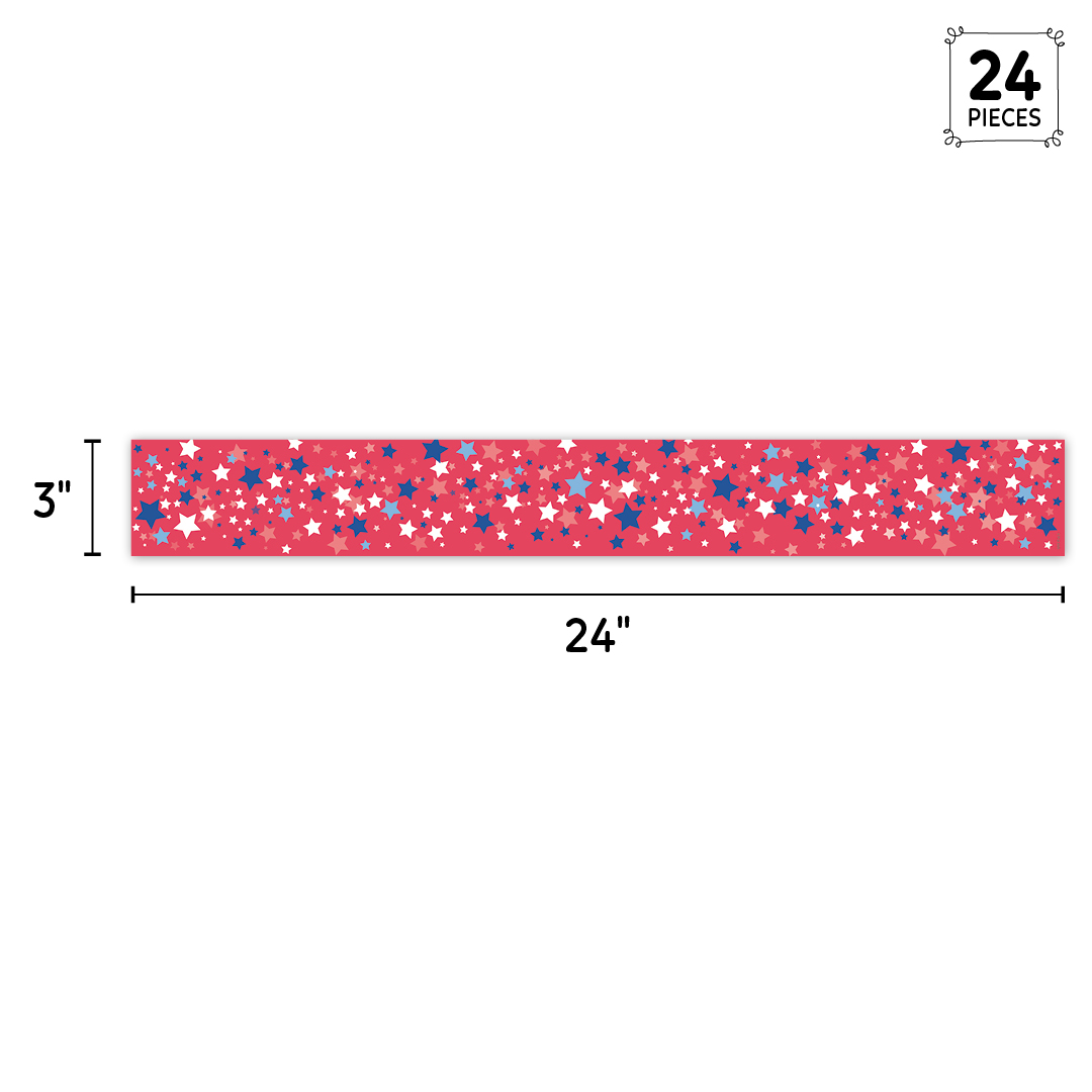 تتميز إطارات تزيين السبورة إي زد بالنجوم الوطنية بنجوم زرقاء وبيضاء على خلفية حمراء لإضافة مبهرة لأي عرض لوحة إعلانات. استخدم الإطار بمفرده أو اطبقه مع إطار آخر للحصول على مظهر فريد. مثالي للاستخدام على لوحات الإعلانات في مجموعة واسعة من إعدادات الفصول الدراسية والمكاتب والمدارس. تأتي كل عبوة مع إطارات كافية لإكمال لوحتي إعلانات كاملتين.