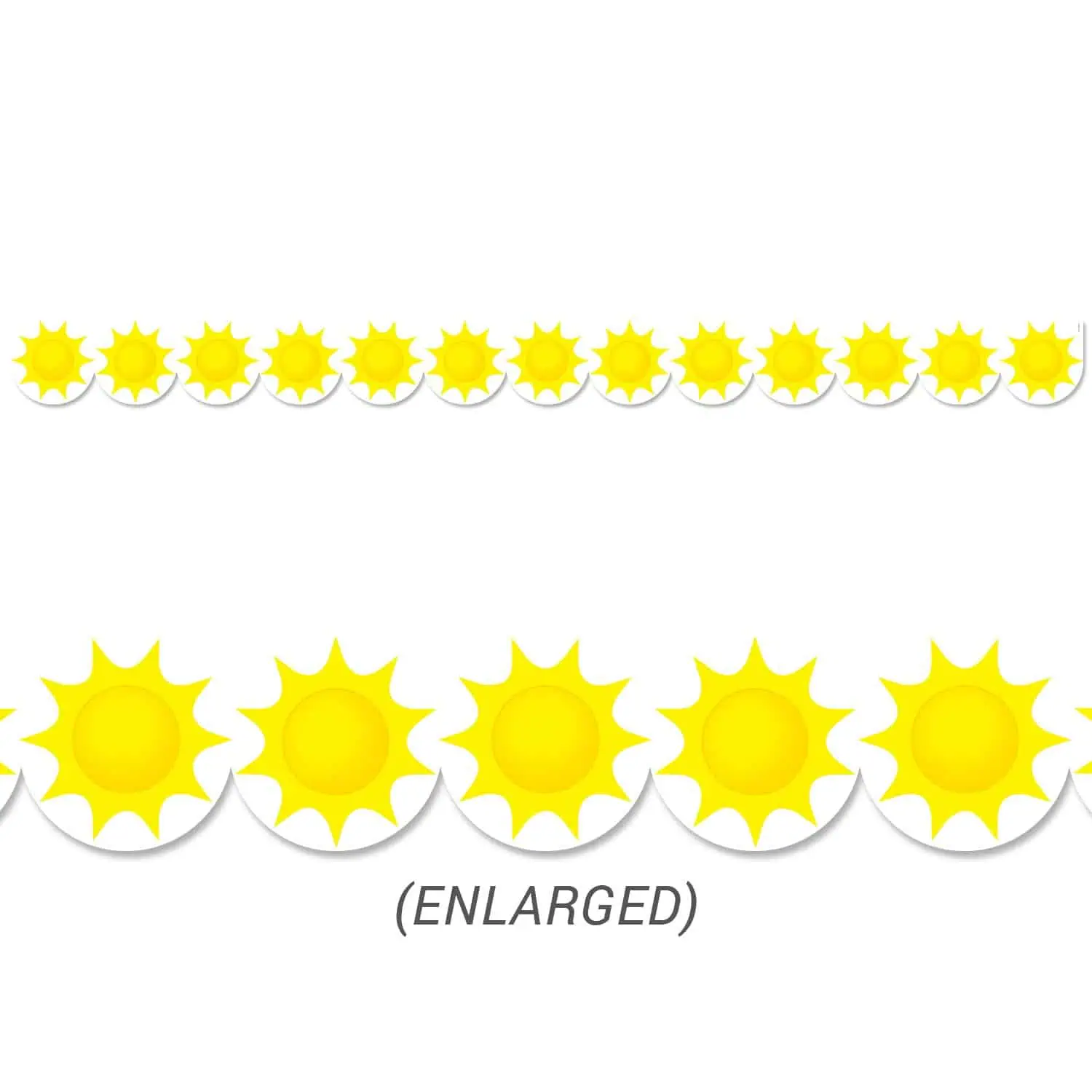Brighten any bulletin board with this cheerful Suns Border. Use these bright suns to trim a variety of bulletin boards with outdoor scenes, such as on a farm, in a garden, in a backyard, and at the beach. Great for displays about nature, science, camping, summer, and plants.