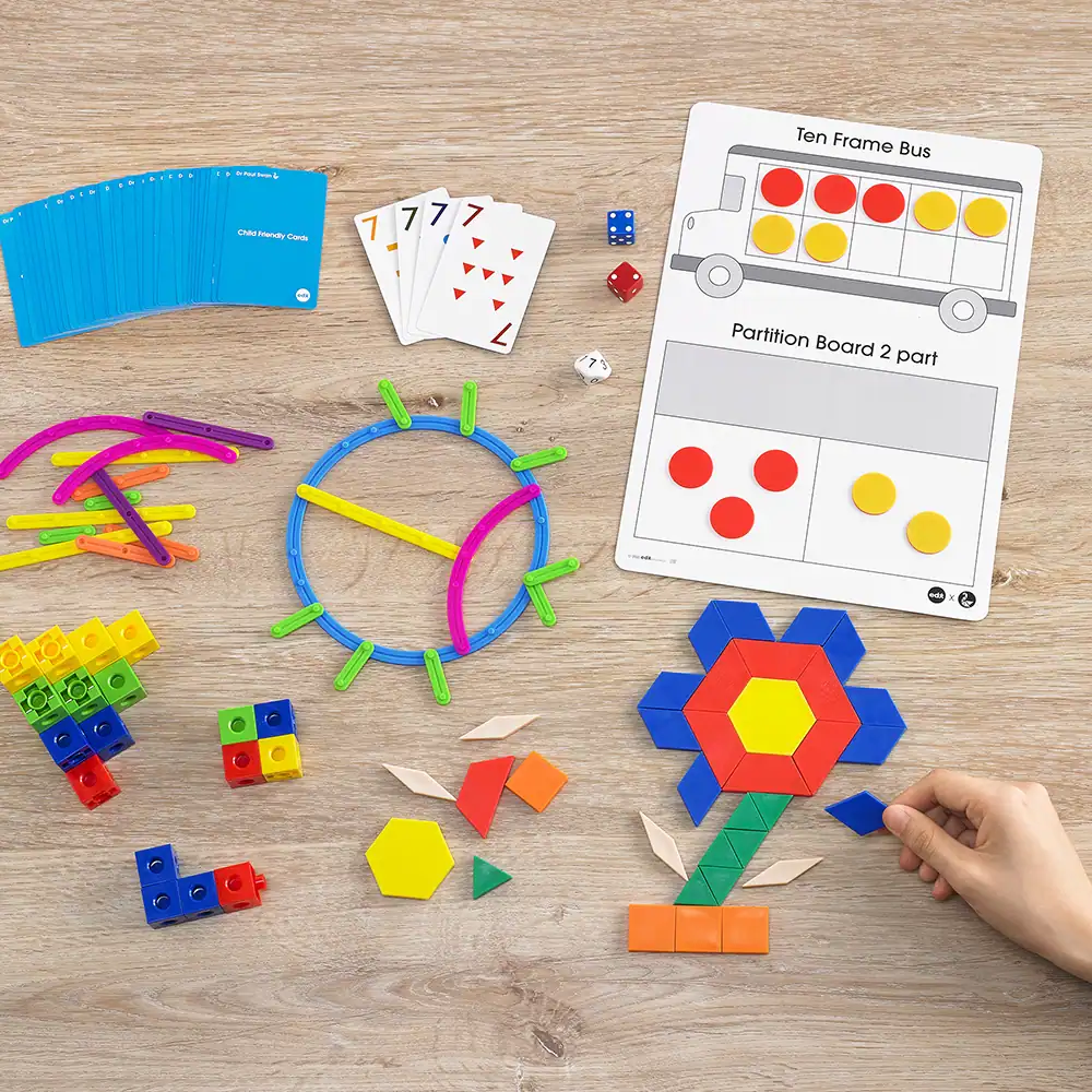 • تتضمن المجموعة: 50 قطعة من كتل الأنماط، 40 مكعبًا للربط، 37 قطعة من GeoStix®، 22 عدادًا، 2 نرد سداسي الجوانب،