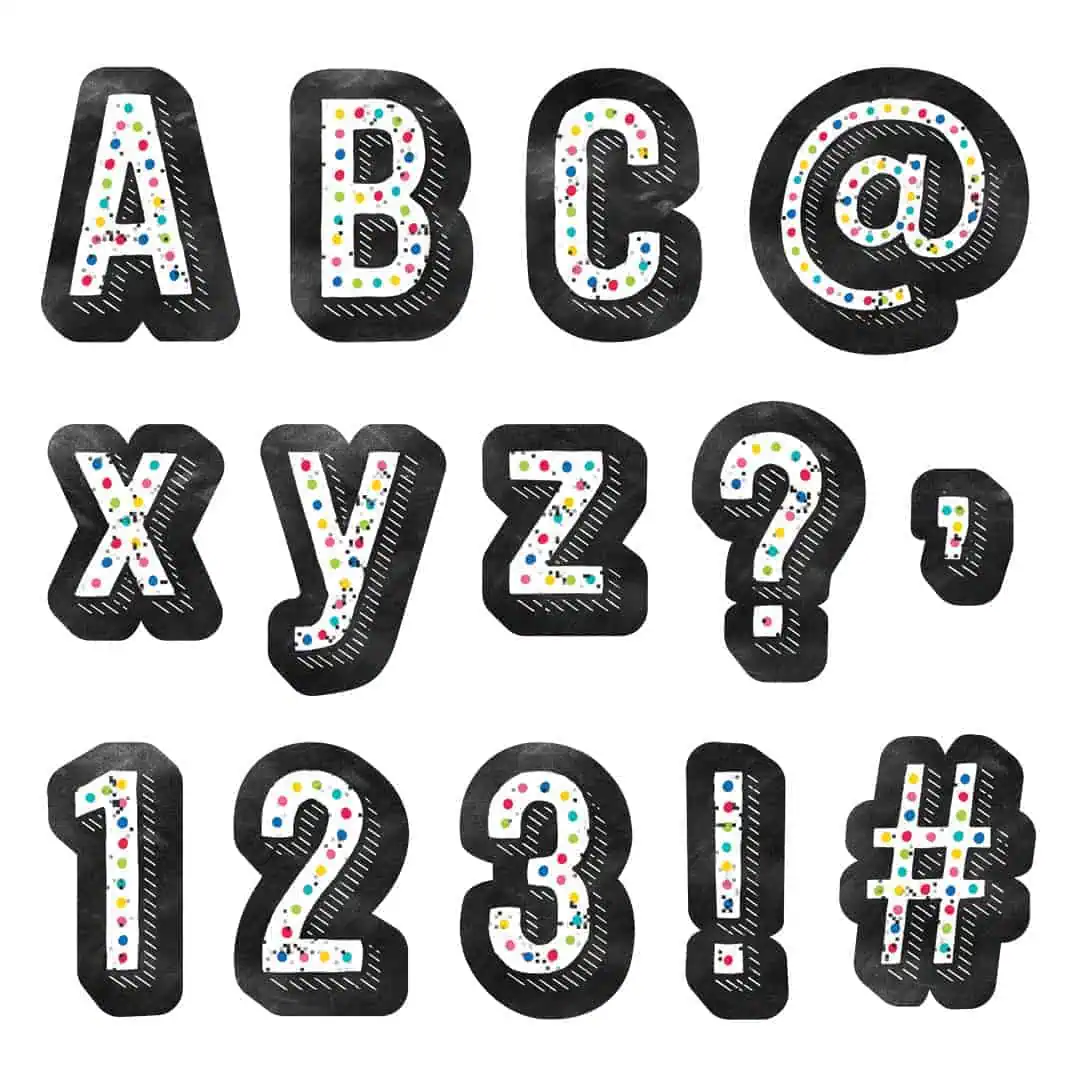 أضف اللون والمرح إلى علاماتك وعناوين لوحات الإعلانات الخاصة بك باستخدام النقاط المضيئة على الحروف المصممة بالطباشير الملونة. تتضمن القطع الـ 216 أحرفًا كبيرة وصغيرة وعلامات ترقيم وأرقامًا ورموز وسائل التواصل الاجتماعي. إن المظهر البسيط والحديث لهذه الحروف المثقوبة يجعلها متعددة الاستخدامات على أي لوحة إعلانات أو عرض في مدرسة أو مكتب أو سكن أو مركز رعاية نهارية. كما أنها رائعة أيضًا لإنشاء لافتات وعلامات الحفلات والمزيد!