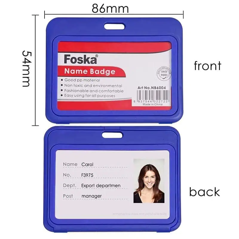 شارة اسم زرقاء مع مشبك ودبوس أمان من فوسكا. الحجم: 90×57 مم دبوس