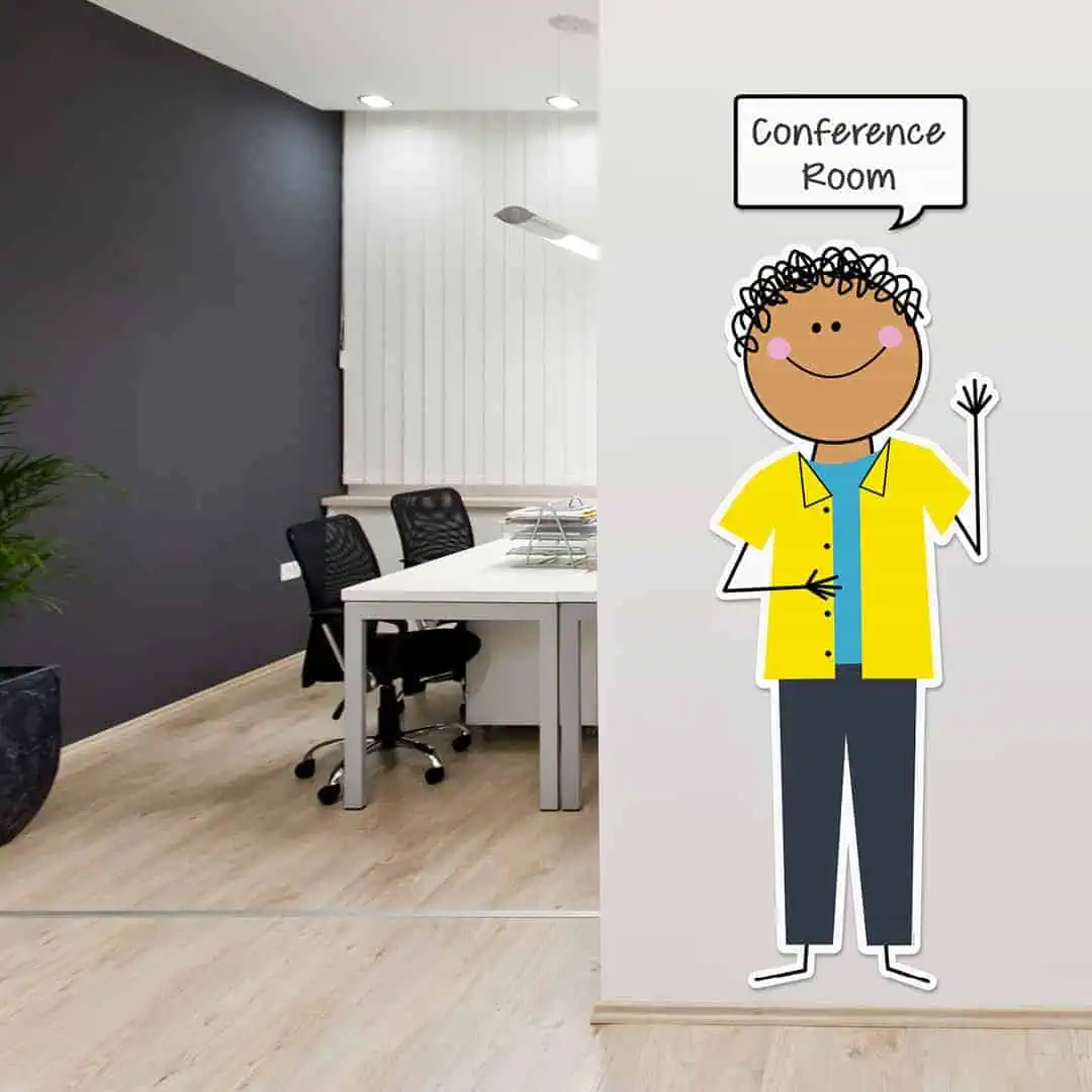 اجعل الرسائل الموجودة على لوحات الإعلانات والأبواب وشاشات الحائط لا تُنسى باستخدام شخصية الطفل العصا العملاقة السعيدة وفقاعة الكلام.