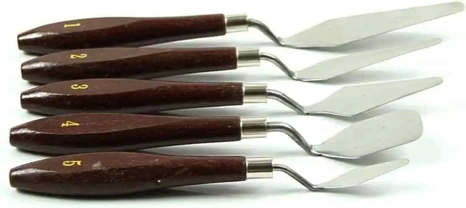 مجموعة مكونة من 5 سكاكين باليت، مثالية للعمل بالزيت على القماش أو اللوحة. توزيع اللون بسرعة وبشكل متساو.