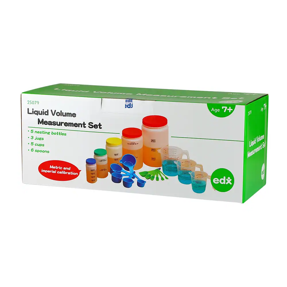 تشمل 5 زجاجات قياس متداخلة، و3 أباريق قياس، و5 أكواب قياس، و6 ملاعق قياس. تدعم التعلم والتطوير المبكر.