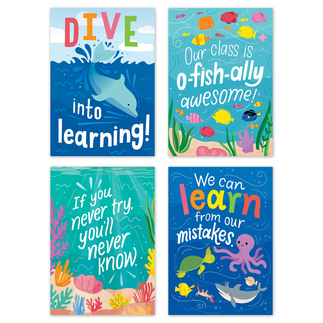 عزز المواقف الإيجابية نحو التعلم من خلال عرض الرسائل المشجعة الموجودة في مجموعة ملصقات أصدقاء البحر الملهمة المكونة من 4 قطع. تتميز هذه الملصقات بصور ملونة لعالم تحت البحر ستضيء أي غرفة بلمسة من الطبيعة.