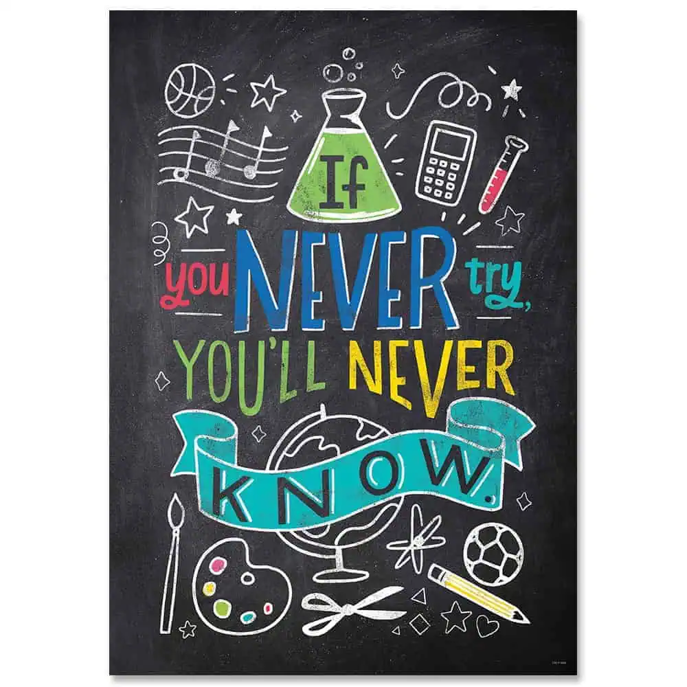 المتعلمين الصغار لتجربة شيء جديد من خلال عرض هذا الملصق، الذي يحمل العبارة “إذا لم تحاول أبدًا، فلن تعرف أبدًا”.