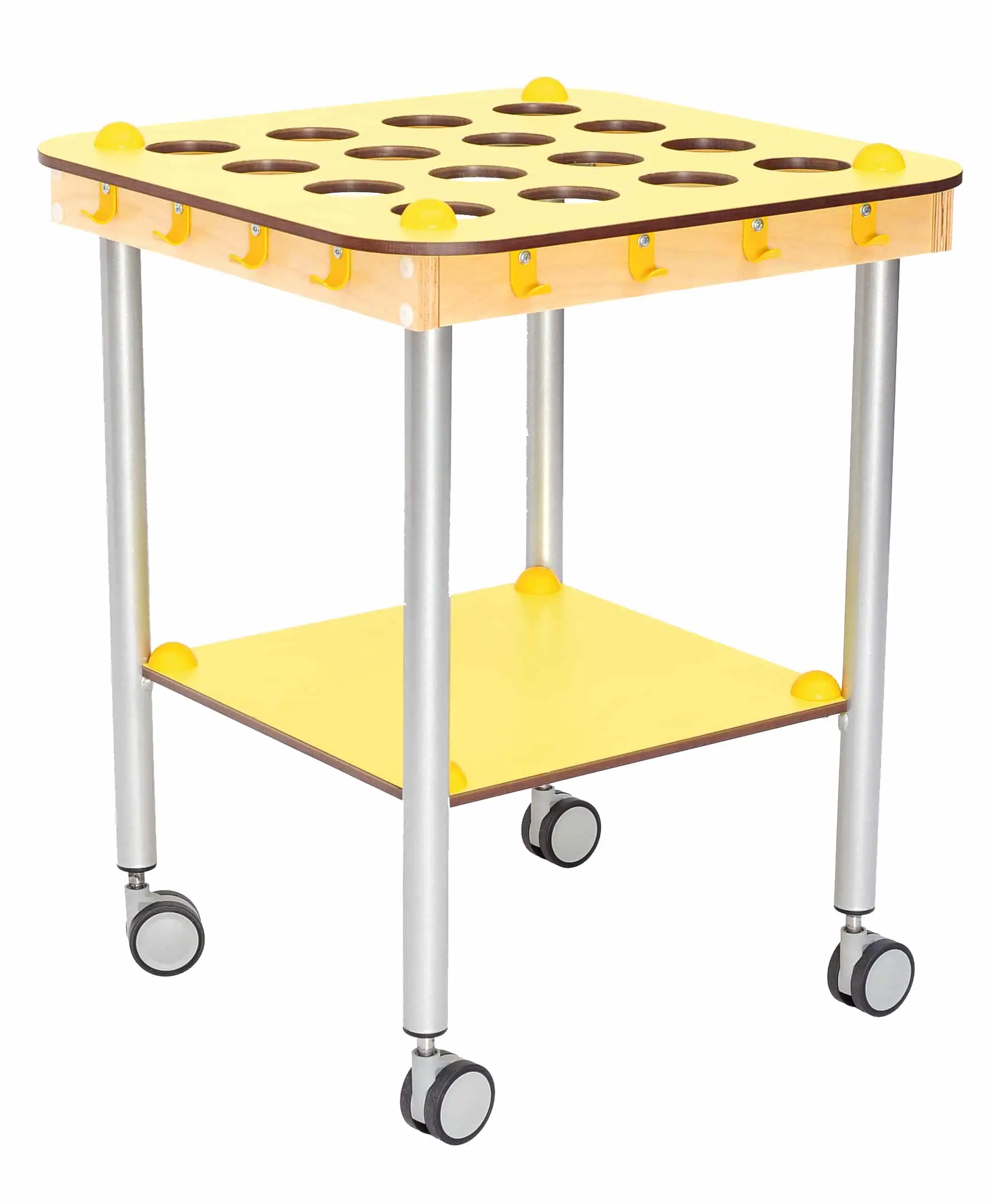 وحدة خشب لتخزين الأكواب والمناشف متحركة Movable table for storing cups and towels. Tabletop and shelf made of chipboard with HPL laminate (thickness: 10 mm), bottom panel made of lacquered plywood. Wheels are equipped with brakes. • dim. 53 x 53 x 65 cm