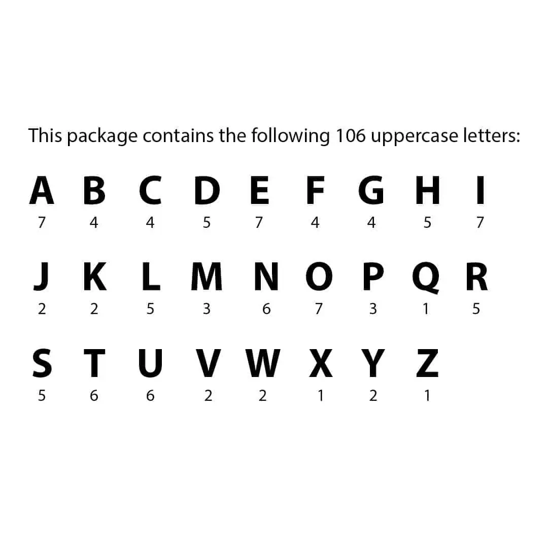A-7, B-4, C-4, D-5, E-7, F-4, G-4, H-5, I-7, J-2, K-2, L-5, M-3, N-6, O-7, P-3, Q-1, R-5, S-5, T-6, U-6, V-2, W-2, X-1, Y-2, Z-1