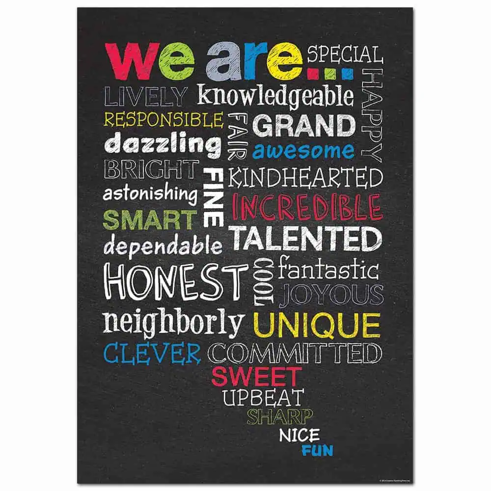 “We are special, lively, knowledgeable, happy, responsible, fair, grand, dazzling, awesome, bright, kindhearted, astonishing, fine, incredible, smart, dependable, talented, honest, cool, fantastic, joyous, neighborly, unique, clever, committed, sweet, upbeat, sharp, nice, fun”