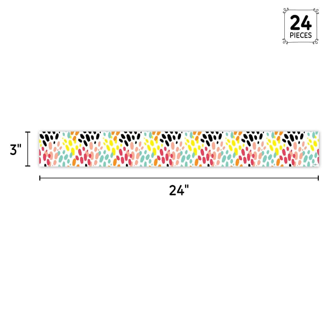 The colorful animal tracks on this Messy Tracks EZ Border will add a splash of fun to any bulletin board display. The festive pattern goes great with Décor from our Jungle Friends Collection and many other design themes. This EZ Border comes in smaller strips, which are easier to manage and store. Each package comes with enough border to complete 2 full bulletin boards.