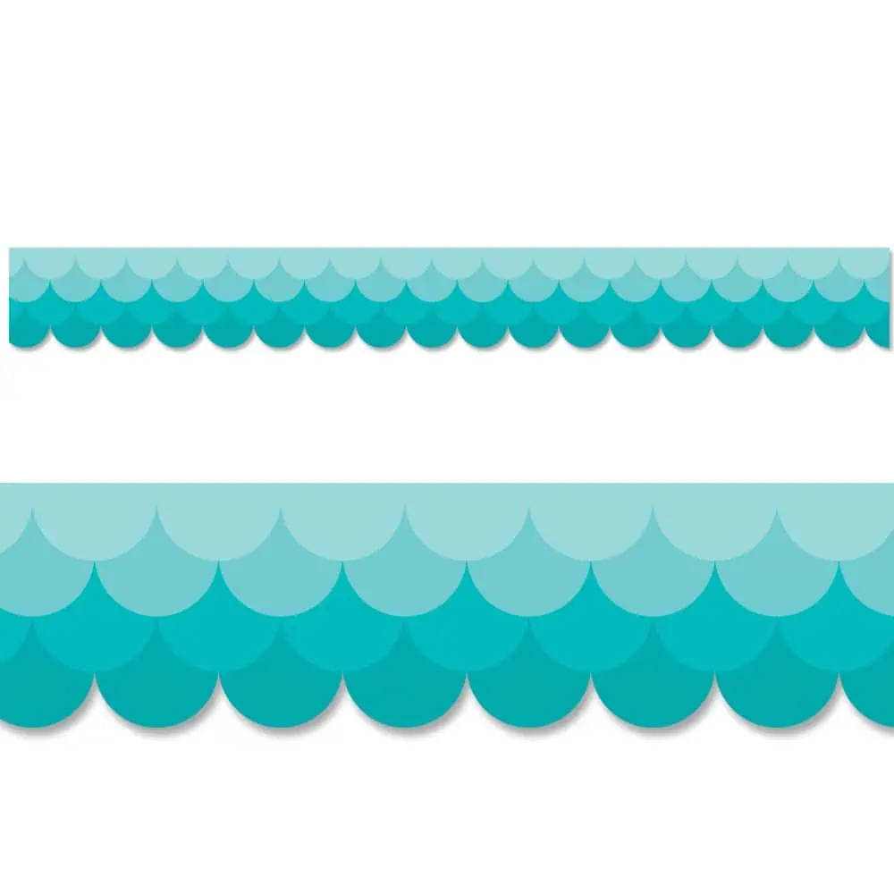 This bright Ombre Turquoise Scallops Border will trim any bulletin board display in style! The bright and colorful ombre turquoise stands out on this versatile bulletin board border that can be used not only in a classroom or at a school but also at an office, a college dorm, or an employee break room. Layer multiple borders to create a special pop in your classroom. These new EZ borders come in smaller strips, which are easier to manage and store. Each package comes with enough borders to complete 2 full bulletin boards.