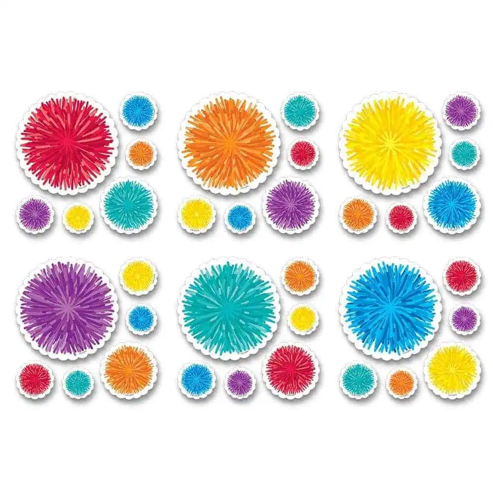 Bring a burst of color to bulletin boards and all around the classroom with these Pom-Poms 6″ Cut-Outs! The fun shape of these versatile cut-outs is perfect for accenting a variety of classroom displays, bulletin boards, and projects. Also, add any content (e.g., math facts, vocabulary or spelling words, or science definitions) to the cut-outs to make instant flash cards, learning cards, or other classroom activity cards. Package includes a variety of pom-pom sizes.