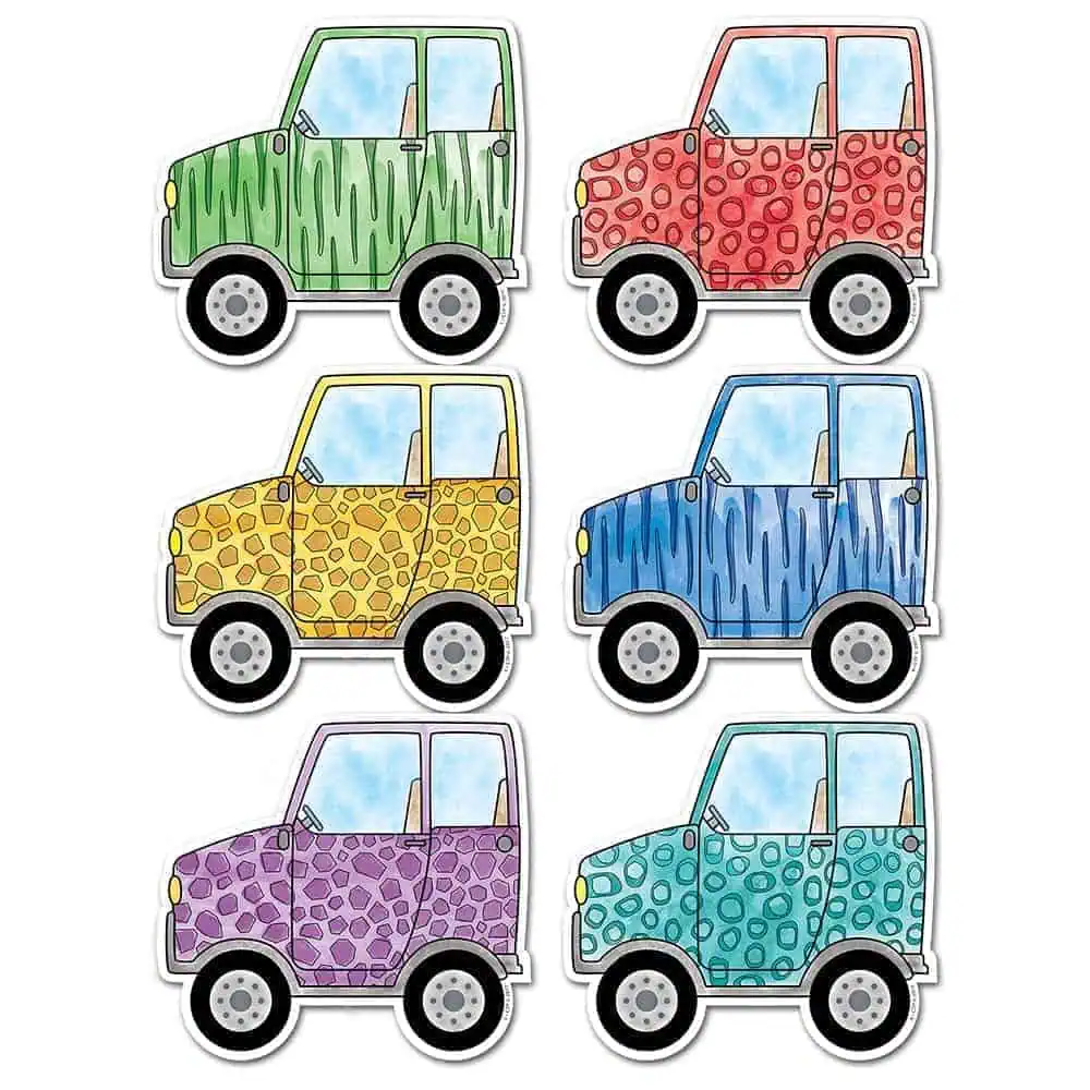 Go on an adventure with these Off-Road Vehicles 3″ Designer Cut-Outs! These rugged-looking 4 x 4 cut-outs are perfect for a variety of classroom displays, bulletin boards, and projects. 36 pieces per package 6 each of 6 colors: red, yellow, green, turquoise, blue, and purple Approximately 3″ Tip: Add any content (e.g. math facts, vocabulary words, or science photos, etc.) to cut-outs to make flash cards, learning cards, or other classroom activity cards.