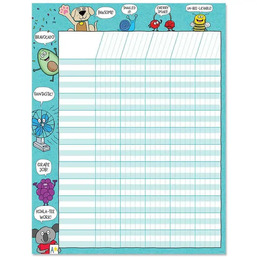 The punny humor and charming characters make this So Much Pun! Incentive Chart a perfect fit for any classroom! The colorful design and positive puns make it versatile for a wide range of ages and many types of uses. Chart includes spaces for 33 student names and 25 assignments.