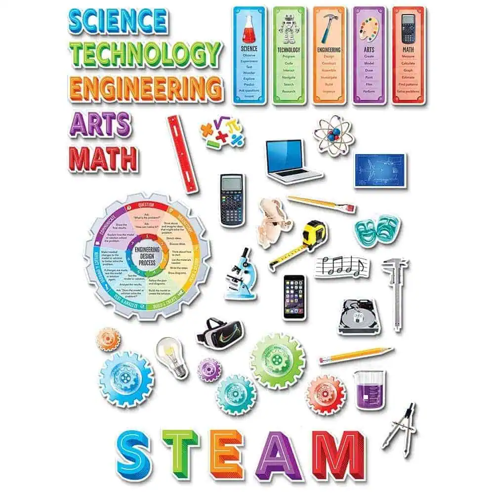 Introduce and teach important concepts with this STEM / STEAM Bulletin Board set. This 42-piece set provides a versatile visual tool to introduce STEM (science, technology, engineering, math) and STEAM (which also includes the arts) concepts, guide students through the engineering design process, and accent any STEM / STEAM display! Can be customized for STEM or STEAM programs. Great for makerspace and STEM classes!