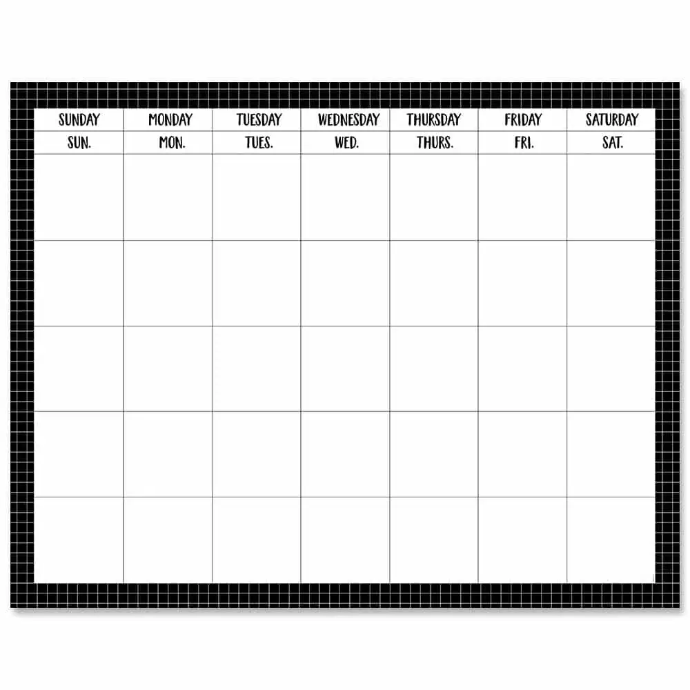 This versatile Window Pane Calendar Chart features big squares for writing in dates or for posting Calendar Days, 3″ Calendar Cut-Outs, or 3″ Designer Cut-Outs.  Use this large classroom calendar during any daily calendar lesson or circle time at a preschool, elementary school, or daycare.  The sleek black and white grid pattern coordinates with any classroom theme.