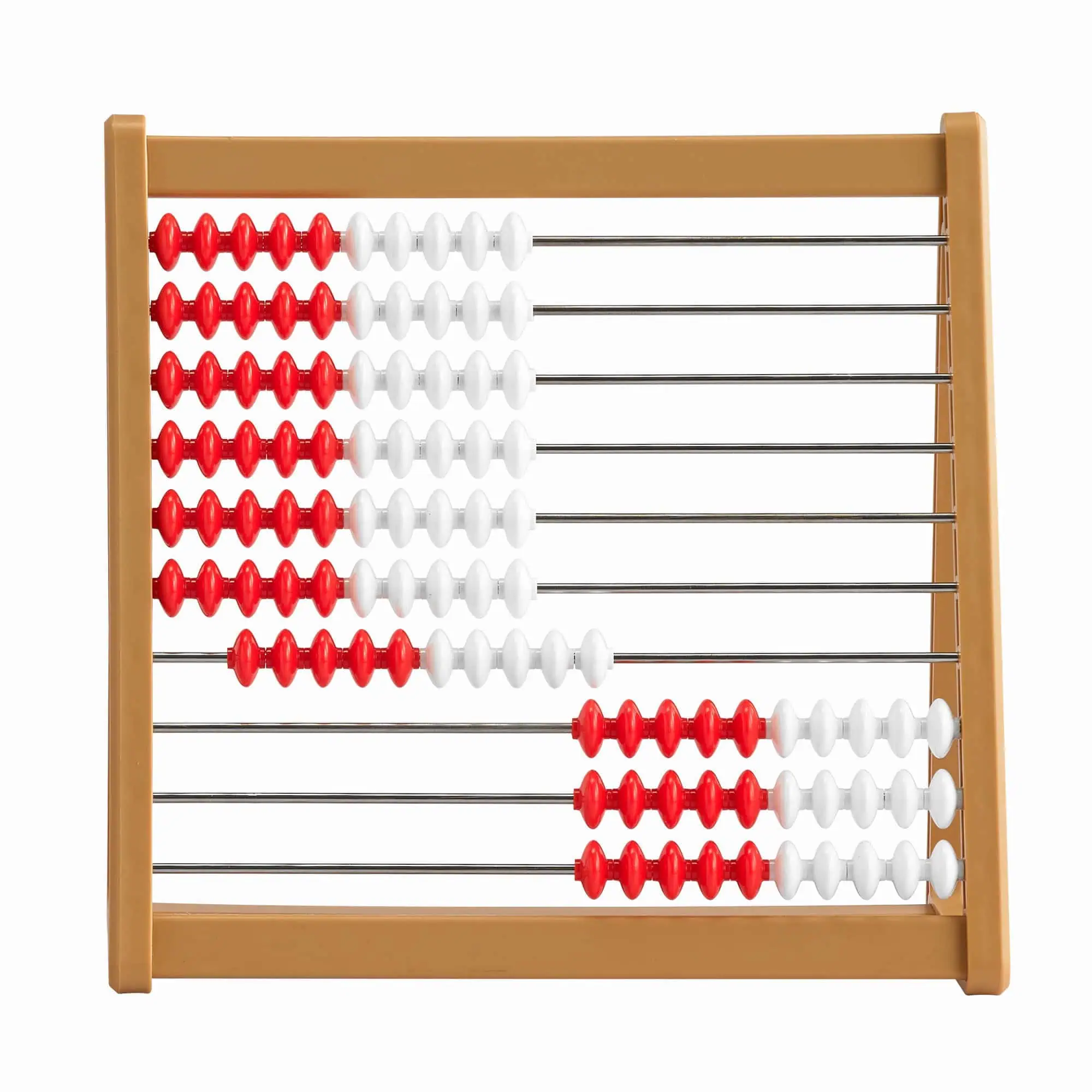 Abacus features ten rows of two different colored plastic beads that easily slide back and forth on metal rods.