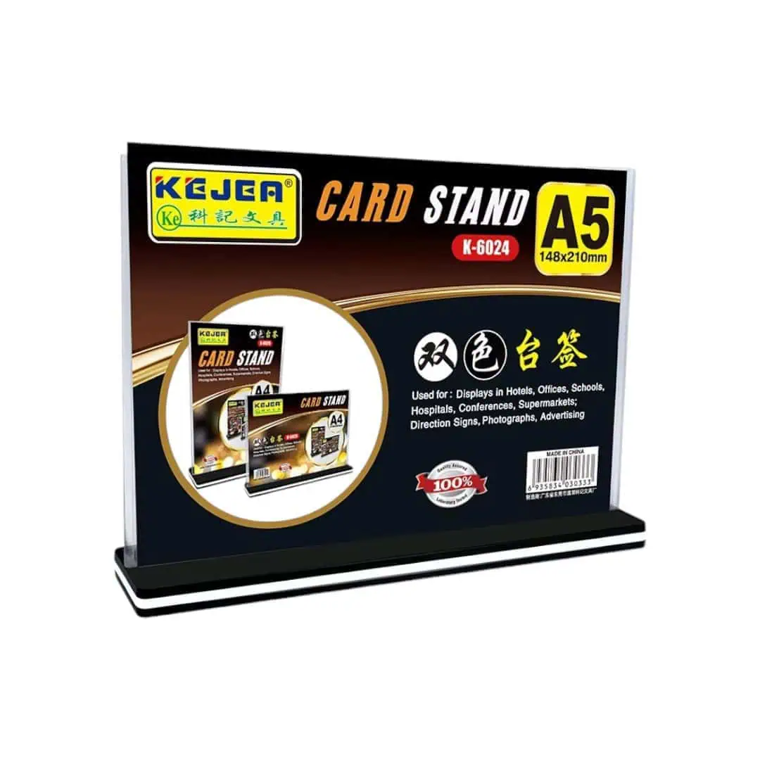 The Black T-shaped Slide Card Stand in a horizontal A5 size, measuring 210mm by 148mm, is a versatile and stylish display solution ideal for showcasing promotional materials, menus, or informational signage. Constructed with a sleek black finish, this stand effortlessly complements any setting, from modern retail environments to professional office spaces. Its T-shaped design ensures stability, allowing it to securely hold cards or signboards in place, while the slide-in feature facilitates easy and quick updates to display content. The horizontal orientation is particularly suited for wider layouts, ensuring maximum visibility and impact for the displayed information. Whether used in a restaurant to present menu specials or in a corporate setting for directional signage, this card stand combines functionality with a contemporary aesthetic, making it a practical choice for various display needs.