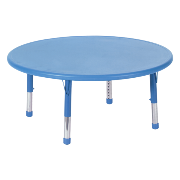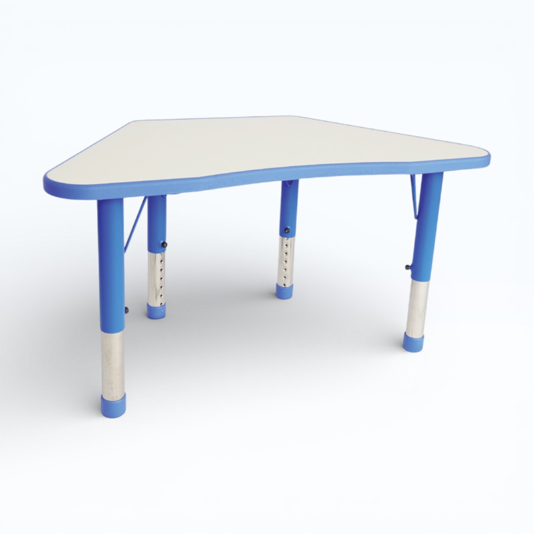 Durable blue adjustable trapezoid classroom table (95x53cm) with height adjustment from 40–60cm. Designed for kindergarten and primary classrooms, ideal for flexible group seating and collaborative learning.