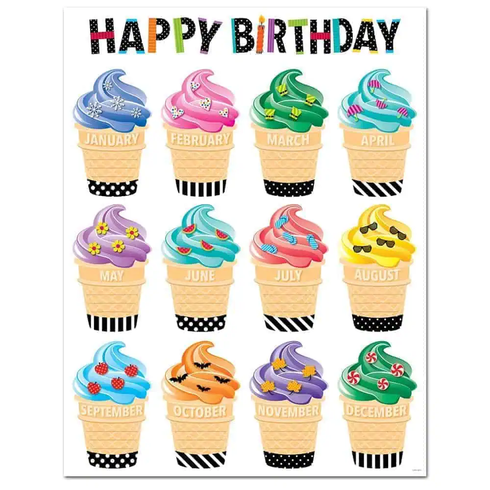 This Bold & Bright Happy Birthday Chart features swirled ice-cream cones, seasonal accents, and playful patterns that will make students feel special on their birthday. This chart is a perfect way to display student birthdays in the classroom, at a daycare, in a church, or at a preschool.