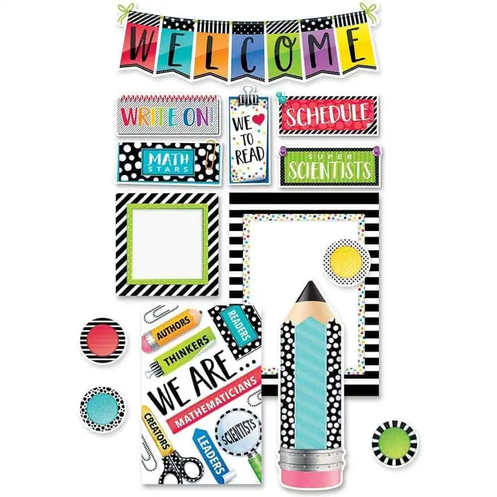 The Bold & Bright Welcome Bulletin Board has a smart and simple look that will brighten any classroom space. The set features bold black and white designs contrasted by pops of bright colors making it a colorful way to welcome students back to school! Stripes, dots, and spots combine with playful school supply accents such as binder clips, push pins, sticky notes, and corkboard to add color and texture to this modern set. The 46-piece set includes: 1 welcome pennants banner 1 oversized blank pencil 36 student pieces 5 subject headlines (We Love to Read, Math Stars, Write On!, Super Scientists, Schedule) 1 motivational “We Are” chart (We are authors, thinkers, readers, mathematicians, scientists, leaders, creators) 1 blank chart 1 blank mini-sign Bulletin board set also includes an instructional guide with bulletin board ideas, classroom activities, and a reproducible.