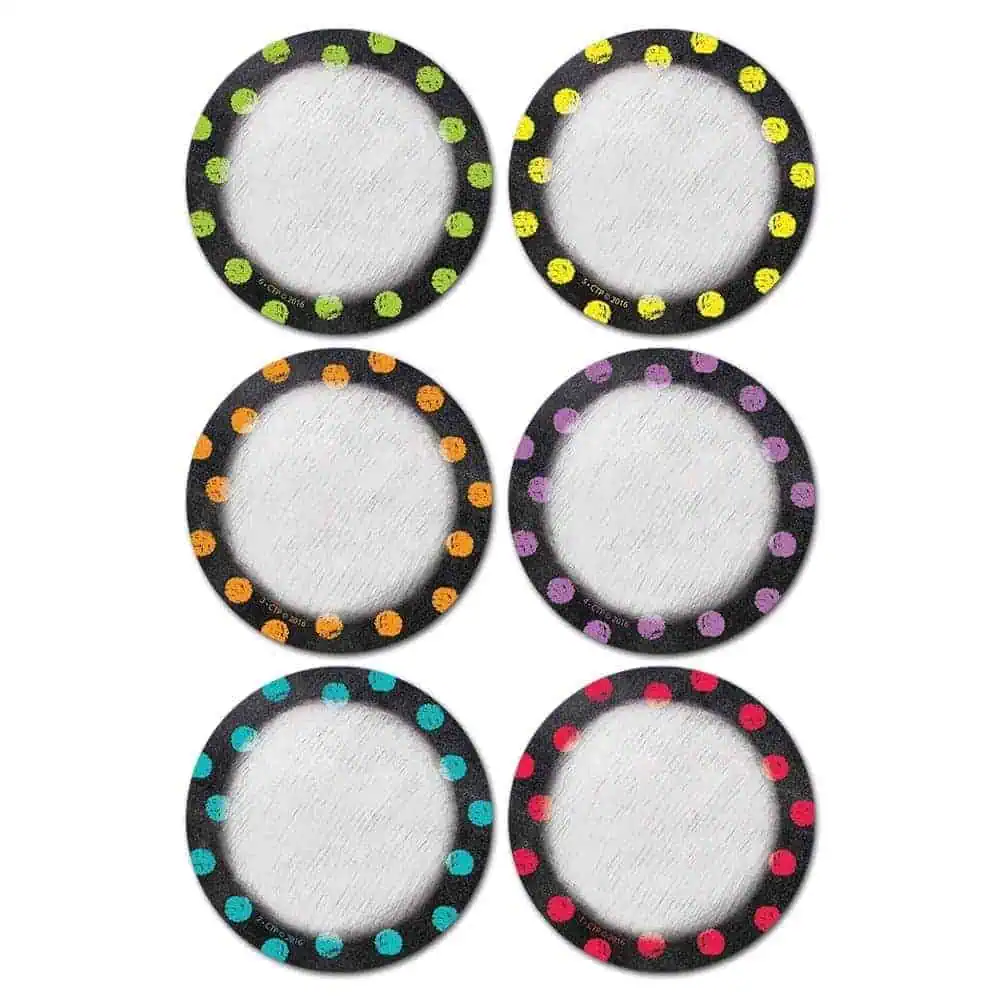 Cute Dots on Chalkboard 3″ color cut-outs combine the charming look of polka-dots with the classic feel of chalkboard. This combination is sure to be a fun accent to any classroom theme.