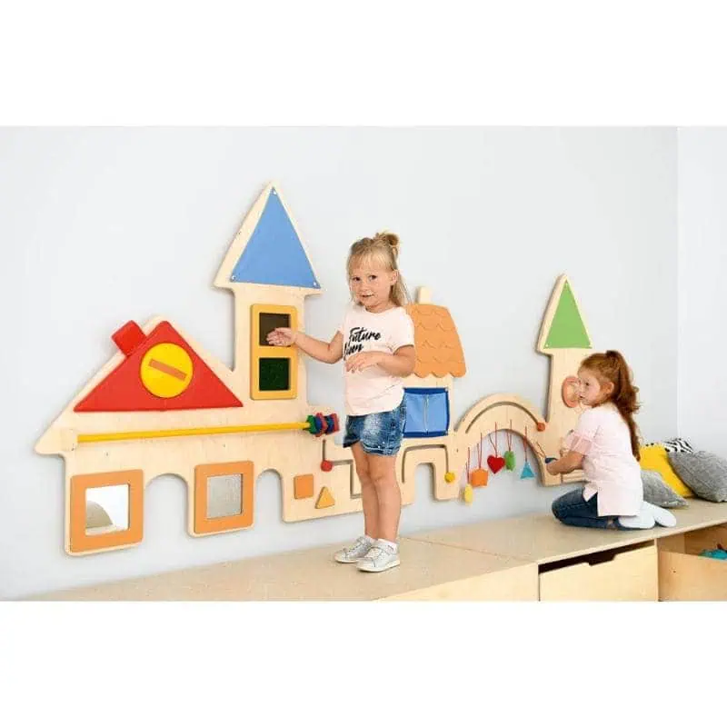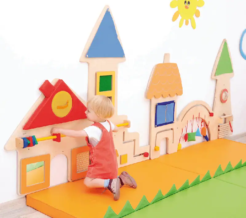 The child learns colors and shapes. A toddler plays by moving shapes placed on rails along the wall. A child practices touch by exploring texture of colorful stamps (smooth and rough), explores hanging colorful objects.