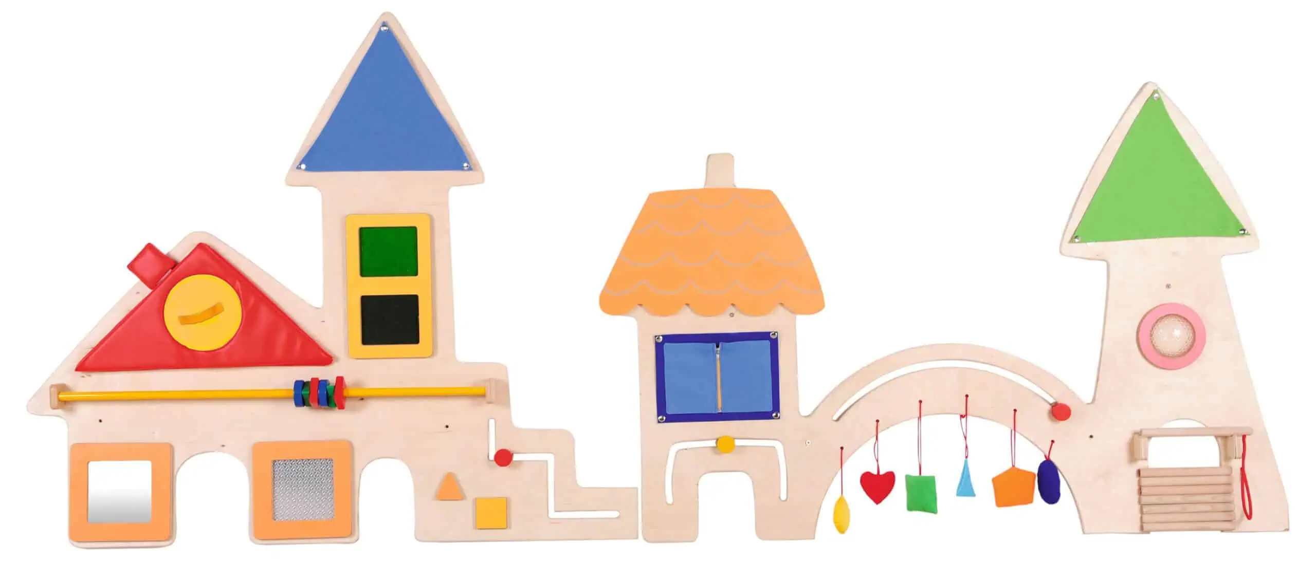 The wall includes: foam roof with a removable window, window with curtains which can be zipped and sticks to tap the sounds.