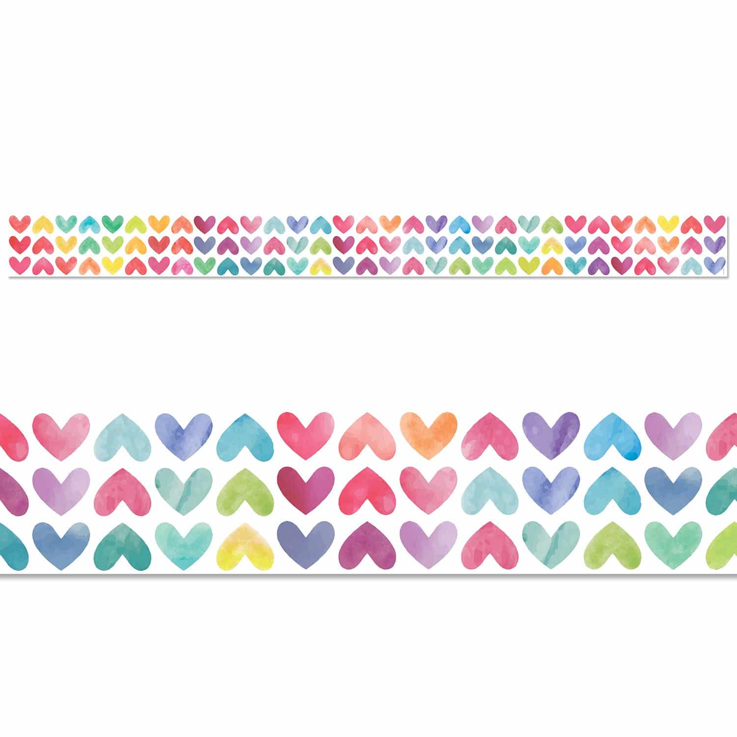 Bring some watercolor love to your bulletin board with this Colorful Hearts Border.  A mixture of bright colors (blue, purple, pink, red, yellow, orange, green, teal), these playful hearts combine transparent colors, soft textures, and subtle dimension to create a vibrant, versatile border. Perfect for bulletin boards for Valentine’s Day, friendship, “all about me,” and diversity.