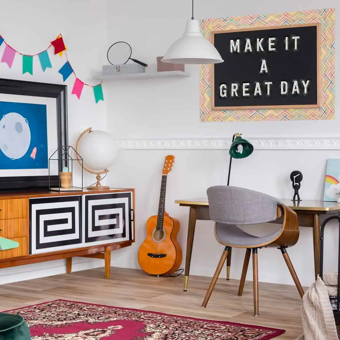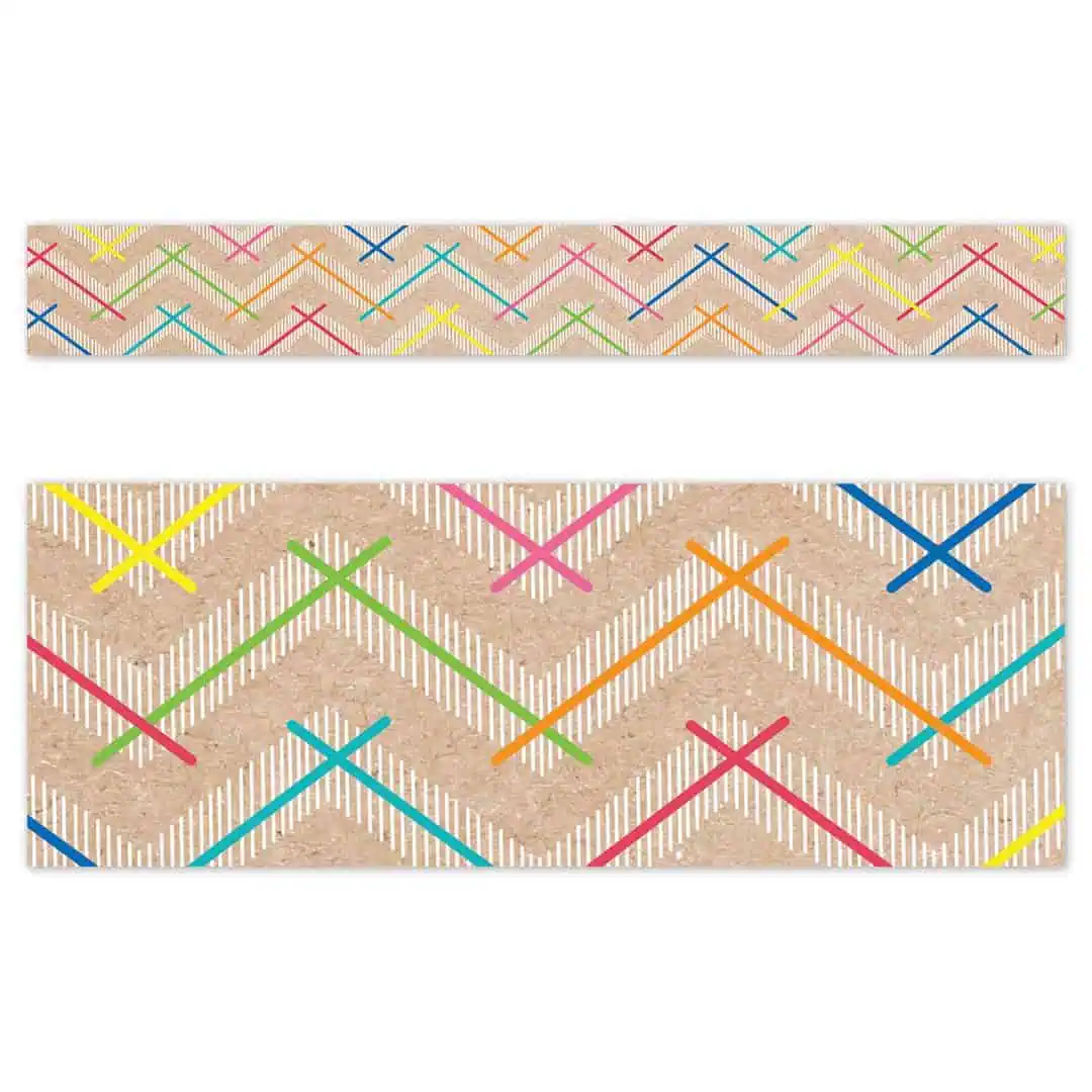 Add a creative touch to your bulletin board displays with the Colorful Kraft Chevron EZ Border, which features a colorful chevron pattern on a kraft-style background. Perfect for use on bulletin boards in a wide variety of classroom, office, and school settings. These EZ borders come in smaller strips, which are easier to manage and store. Each package comes with enough borders to complete 2 full bulletin boards.