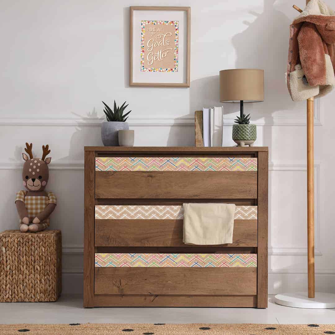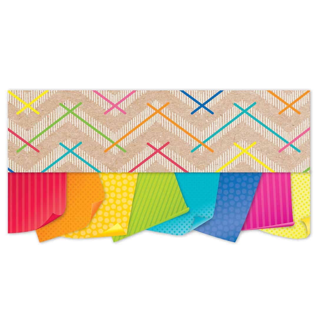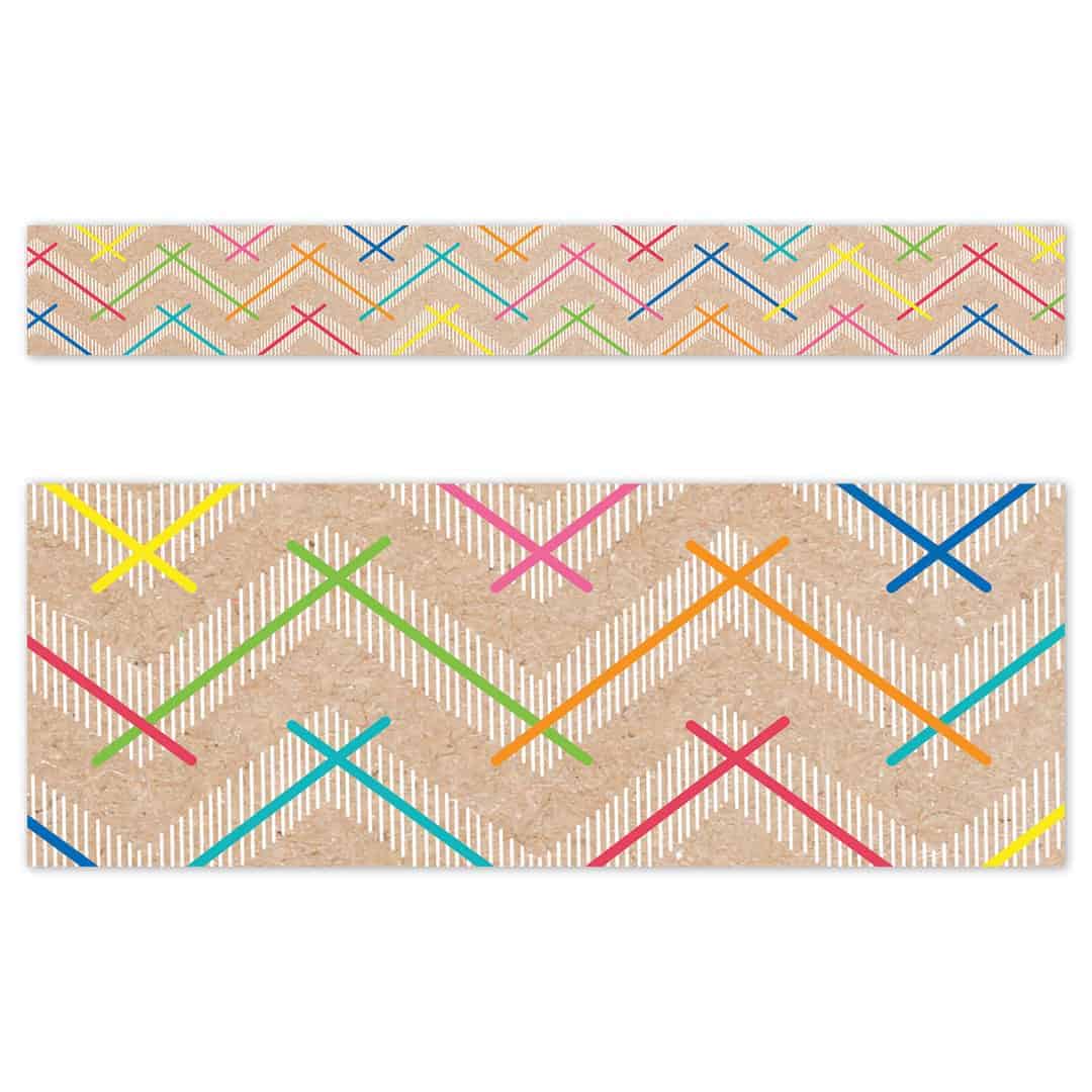 Add a creative touch to your bulletin board displays with the Colorful Kraft Chevron EZ Border, which features a colorful chevron pattern on a kraft-style background. Perfect for use on bulletin boards in a wide variety of classroom, office, and school settings. These EZ borders come in smaller strips, which are easier to manage and store. Each package comes with enough borders to complete 2 full bulletin boards.