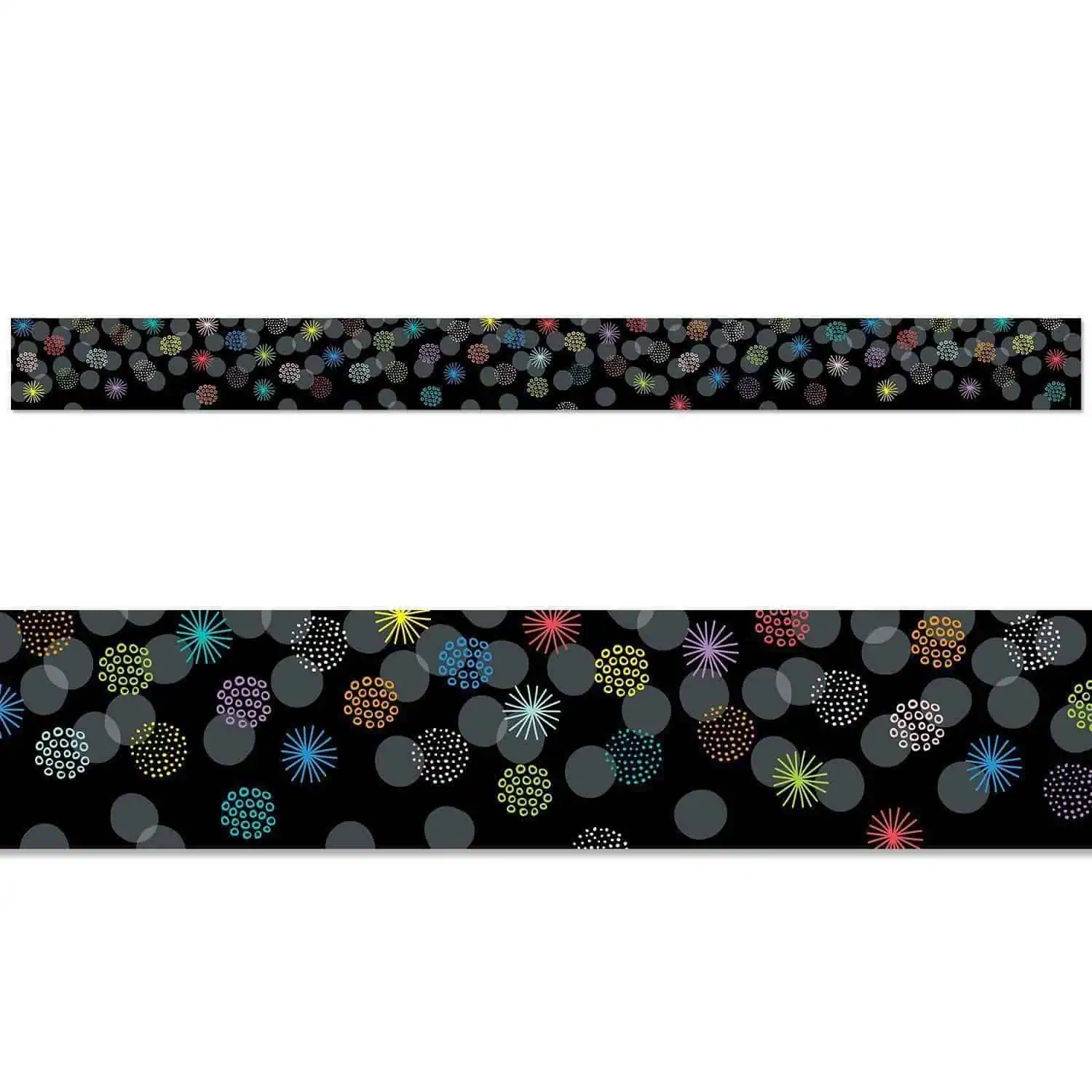 Give bulletin boards a fresh look and dimension with this Dots and Doodles Border. This unique border features a bold combination of opaque gray dots layered with colorful bursts and doodles set against a black background to create a holographic-type effect. Layer with a lime green solid border for a modern-looking, floral theme for the spring or summer