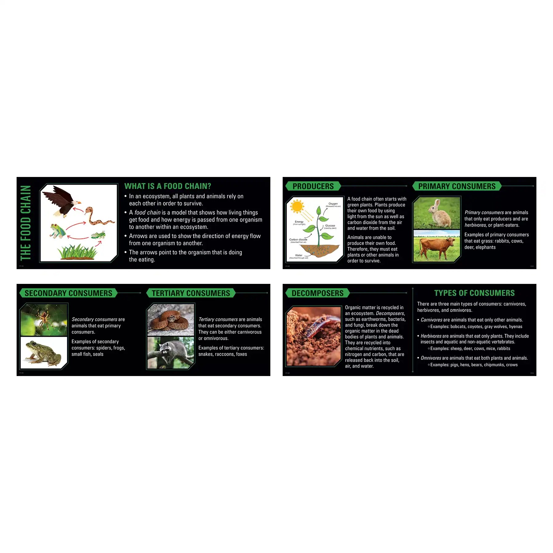 The Ecosystems Whiteboard Topper focuses on the food chain and highlights related academic vocabulary: producers, primary consumers, secondary consumers, tertiary consumers, decomposers, and types of consumers. Each vocabulary word is accompanied by a photo of an everyday object that students can easily identify with.