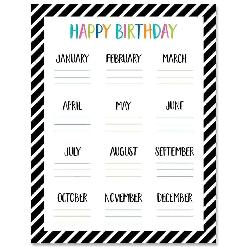 Bold stripes are accented by bright colors to highlight student birthdays. This Core Decor Birthday Chart is a perfect way to display student birthdays in the classroom, at a day care, in a , or at a preschool.