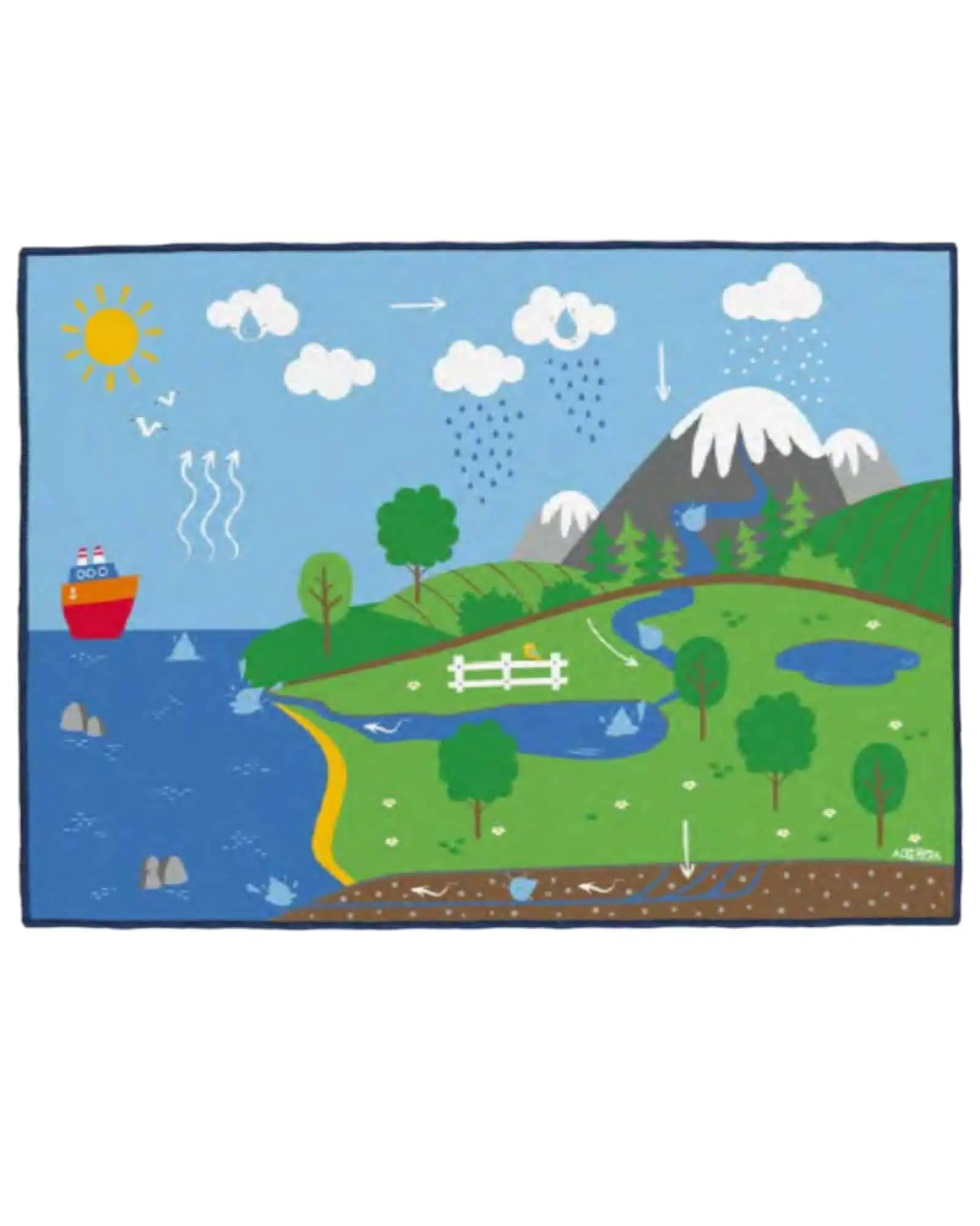 The Water Cycle Print 1214 Runner Giant Mat is a large, educational floor covering measuring 200×300 cm. It features a detailed, colorful illustration of the water cycle, making it an excellent learning tool for children. The mat is not only educational but also functional, providing a comfortable surface for play or relaxation. Its large size makes it suitable for group activities, encouraging social interaction and collaborative learning. The mat is made from durable materials, ensuring it can withstand heavy use. Unique selling points include its combination of education and functionality, its large size for group use, and its durability.