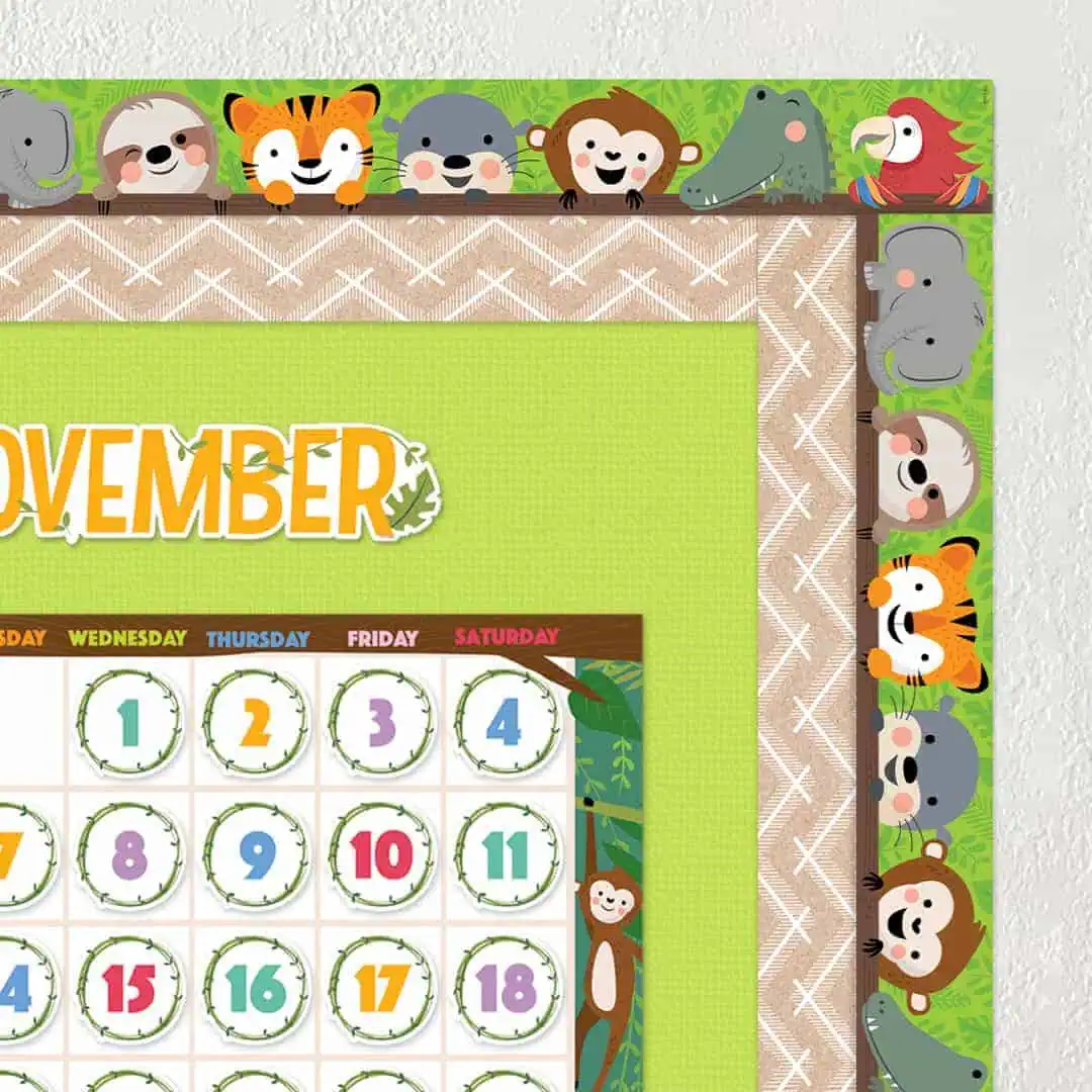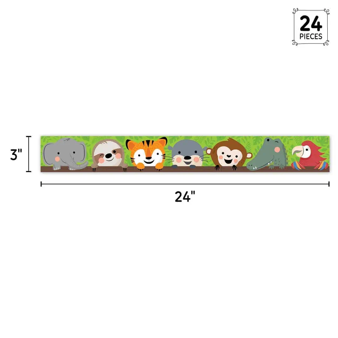 The adorable animals on our Jungle Friends EZ Border make any bulletin board more fun! This border features 7 jungle favorites—elephant, sloth, tiger, otter, monkey, crocodile, and parrot—with a lush green backdrop, the perfect complement to other décor items in our Jungle Friends Collection. This EZ Border comes in smaller strips, which are easier to manage and store. Each package comes with enough border to complete 2 full bulletin boards.