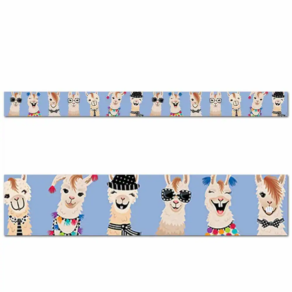Need a cute border? No prob-llama! This Llamas Border features charming llamas on a colorful background. Their cheerful personalities and silly smiles will surely be a fun trim on any bulletin board or classroom display. 35 feet per package Width: 3″