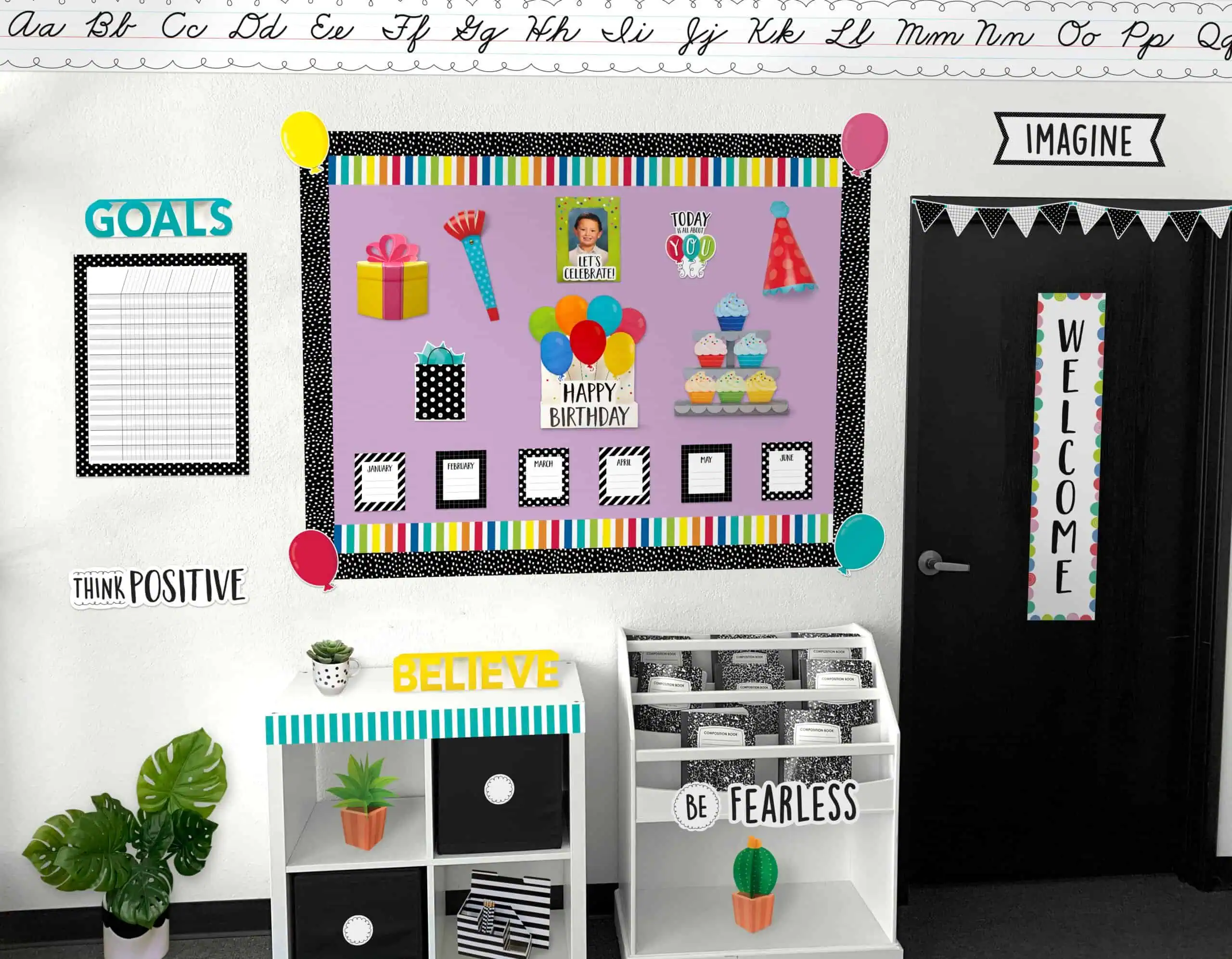 The newest trend in polka dots are messy dots! This Core Decor Messy Dots on Black Border features casual white polka dots on a black background. This is a bold and versatile way to trim any bulletin board or classroom display in any type of school setting at any grade level! Also great for use in an office, a church, a college dorm, or homeschool classroom. With its simple design, this bulletin board border can be used alone to create a basic look or layered with another border for a more designer look. These new EZ borders come in smaller strips, which are easier to manage and store. Each package comes with enough borders to complete 2 full bulletin boards.