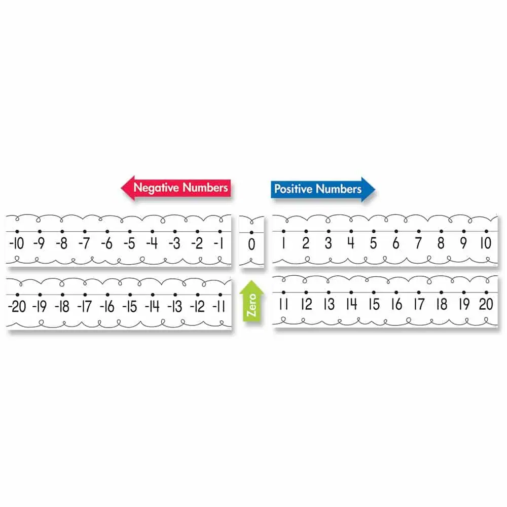 A handy reference for every classroom, this Core Decor Number Line Bulletin Board includes the numbers from -20 to 120. Set also includes three labels (Negative Numbers, Positive Numbers, and Zero). Use this number line as a handy reference for any age or grade level of elementary school students. Entire number line measures 28.25′ long x 5.75″ high.