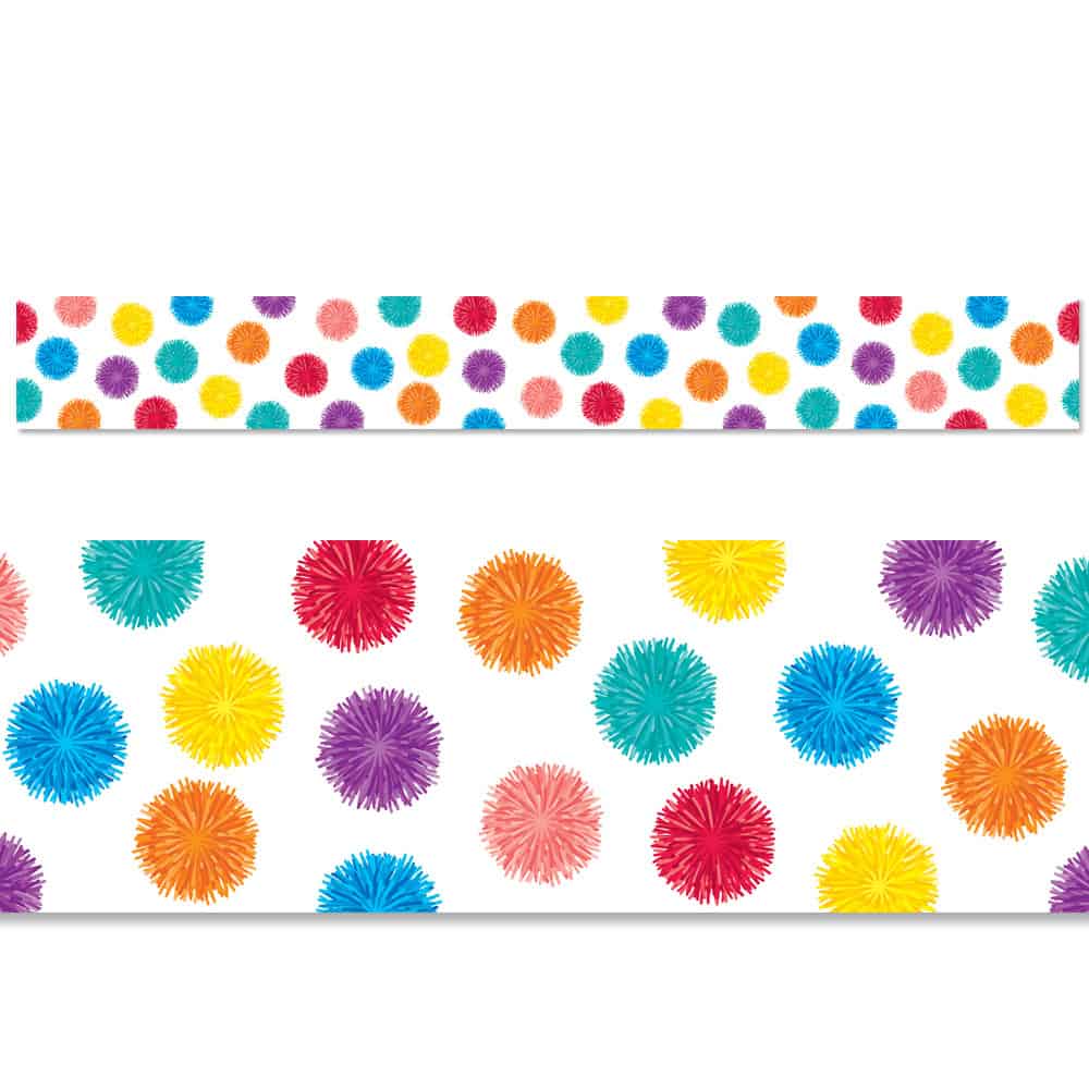 It’s pom-poms! It’s polka dots! It’s Pom Dots! A rainbow of colorful mini pom-poms (pink, orange, red, turquoise, yellow, blue, and purple) are featured on a white background on this Pom Dots Border. The cheerful rainbow-colored pom-pom dots are perfect for use on just about any bulletin board or in any grade classroom. The bright colors and festive design will make this a fun trim on bulletin boards featuring student art, Cinco de Mayo celebrations, and crafts. These new EZ borders come in smaller strips, which are easier to manage and store. Each package comes with enough borders to complete 2 full bulletin boards.