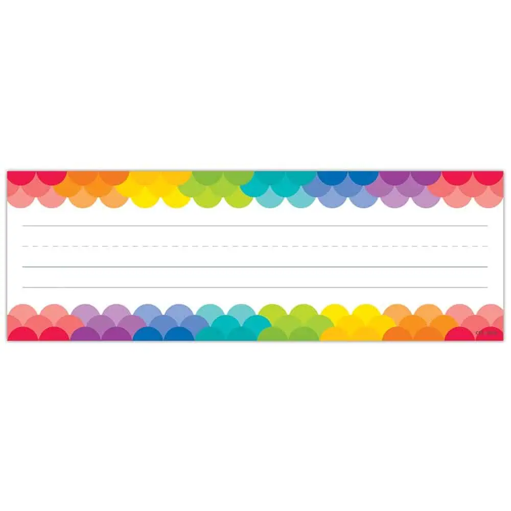 These colorful Rainbow Scallops name plates will accent just about any classroom theme. Name plates can be used to personalize student desks, cubbies, seats at the table, take-home bags, classroom cabinets, folders, library book boxes and more! Student name plates are a must-have for any classroom. Name plates are 9 ½” x 3 ¼” 36 name plates per package