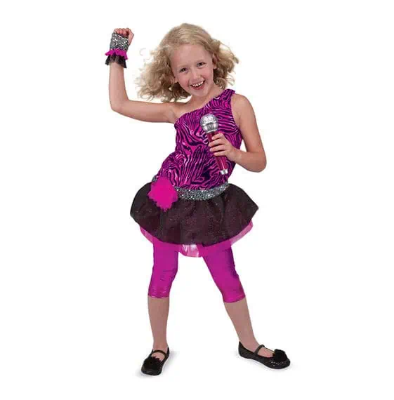 Includes shiny pink leggings, zebra-print dress with glittery tulle skirt, ruffled glove, and pretend-play microphone.