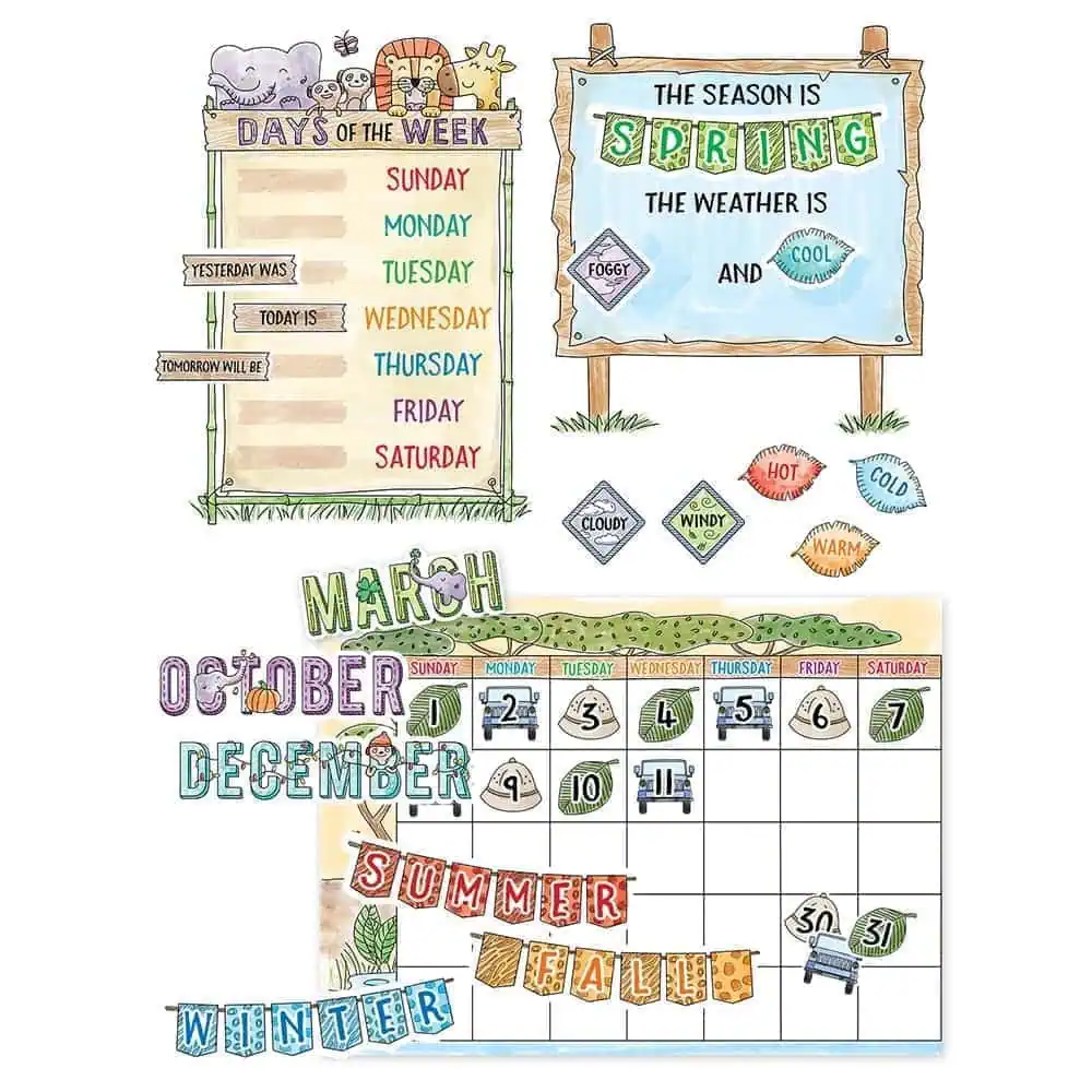 This 67-piece calendar set features a calendar chart, 12 month headlines, 31 pre-numbered calendar days, and 4 blank calendar days. The set also includes a days-of-the-week chart, a seasons and weather chart, coordinating labels, and safari accents (4 safari leaves, 3 binoculars, and 3 pith hats).