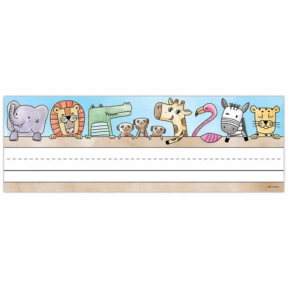 These Safari Friends Name Plates feature cute safari animals (elephant, lion, crocodile, meerkat, giraffe, flamingo, zebra, and cheetah) all in a row. Name plates can be used to personalize student desks, cubbies, seats at the table, take-home bags, classroom cabinets, folders, and more! These student name plates are great for use in the classroom, at a day care, at a , or at a preschool. Students will love the adorable Safari Friends on these school name plates. Name plates are 9 ½” x 3 ¼” 36 name plates per package