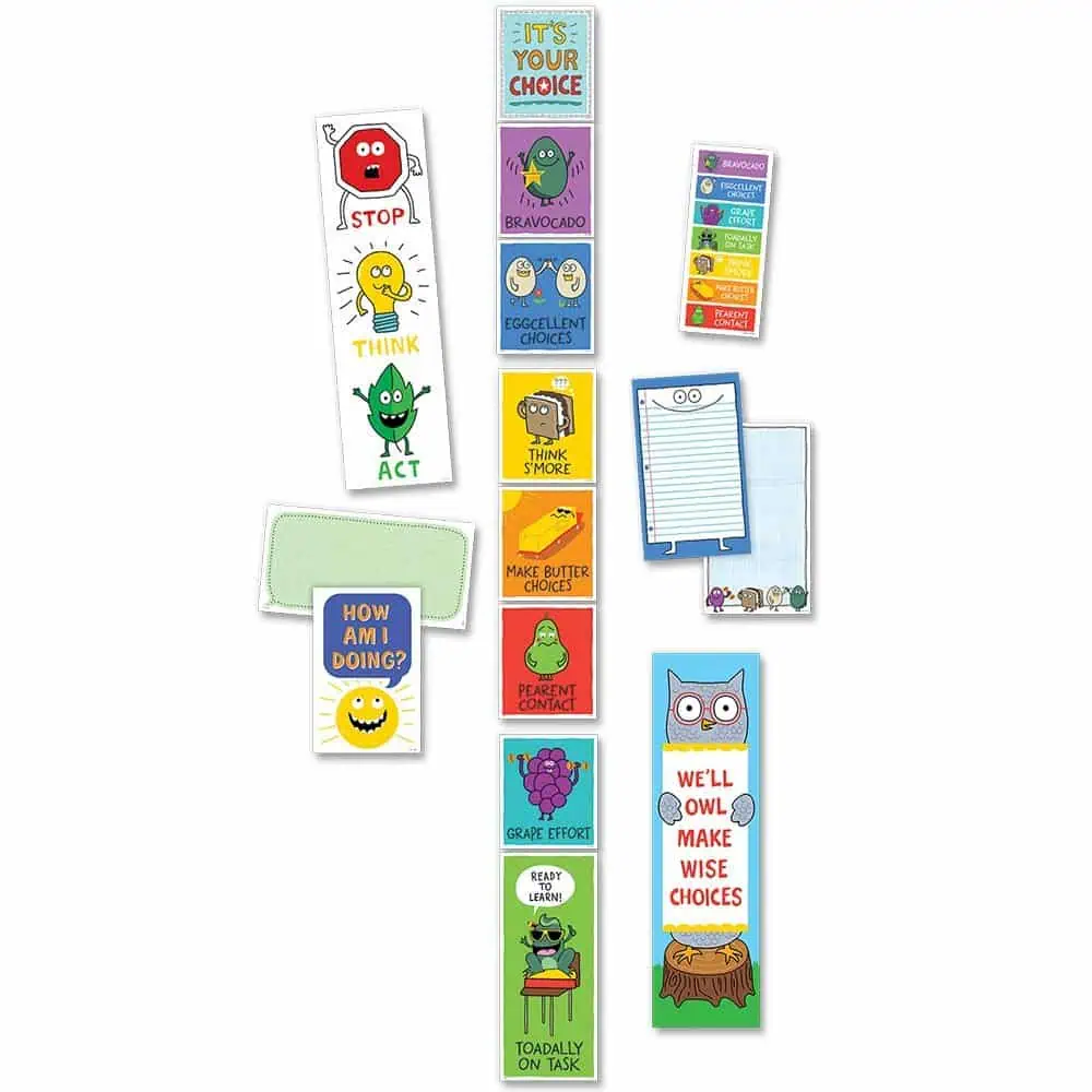 This So Much Pun! Behavior Clip Chart is a whole-class management tool that will help students keep track of their behavior throughout the day and develop personal accountability for their choices. This colorful 20-piece classroom management set contains 9 preprinted behavior clip chart pieces, 2 customizable blank behavior clip chart pieces, 1 blank label, 6 desktop behavior clip charts, and 2 motivational messages (“Stop.Think. Act.” sign featuring a stoplight and a “We’ll Owl Make Wise Choices” sign).