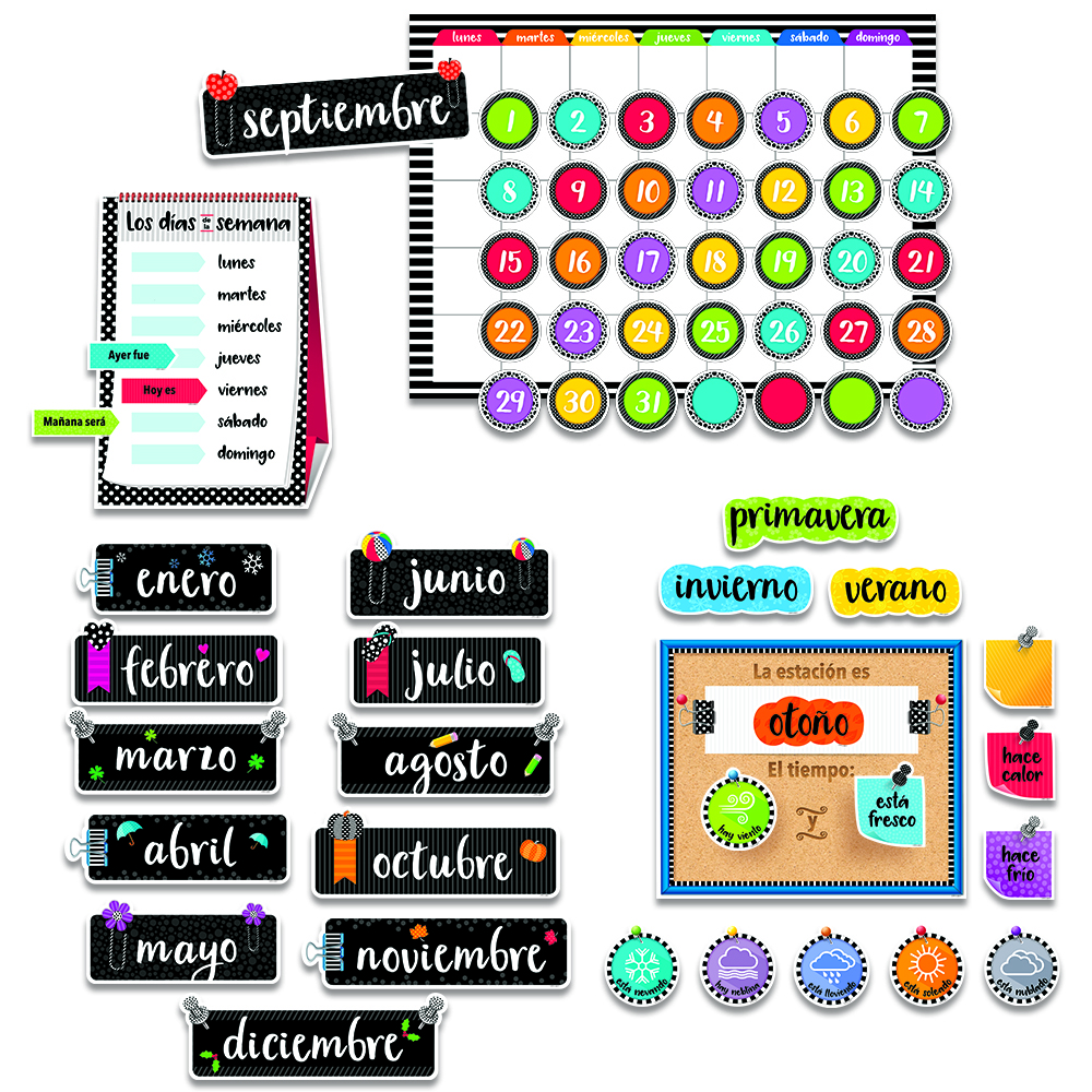 The Bold & Bright Juego de Calendario (Calendar) Set Bulletin Board features bold black and white contrasted by pops of bright colors. Stripes, dots, and spots combine with playful school supply accents such as binder clips, push pins, sticky notes, and corkboard to add color and texture to this modern look. This 67-piece calendar set includes a calendar chart, 12 month headlines, 31 pre-numbered calendar days, and 4 blank calendar days. The set also includes a days-of-the-week chart, a seasons and weather chart, and coordinating labels. The bright colors and modern design make this set perfect for children and adults of all ages.