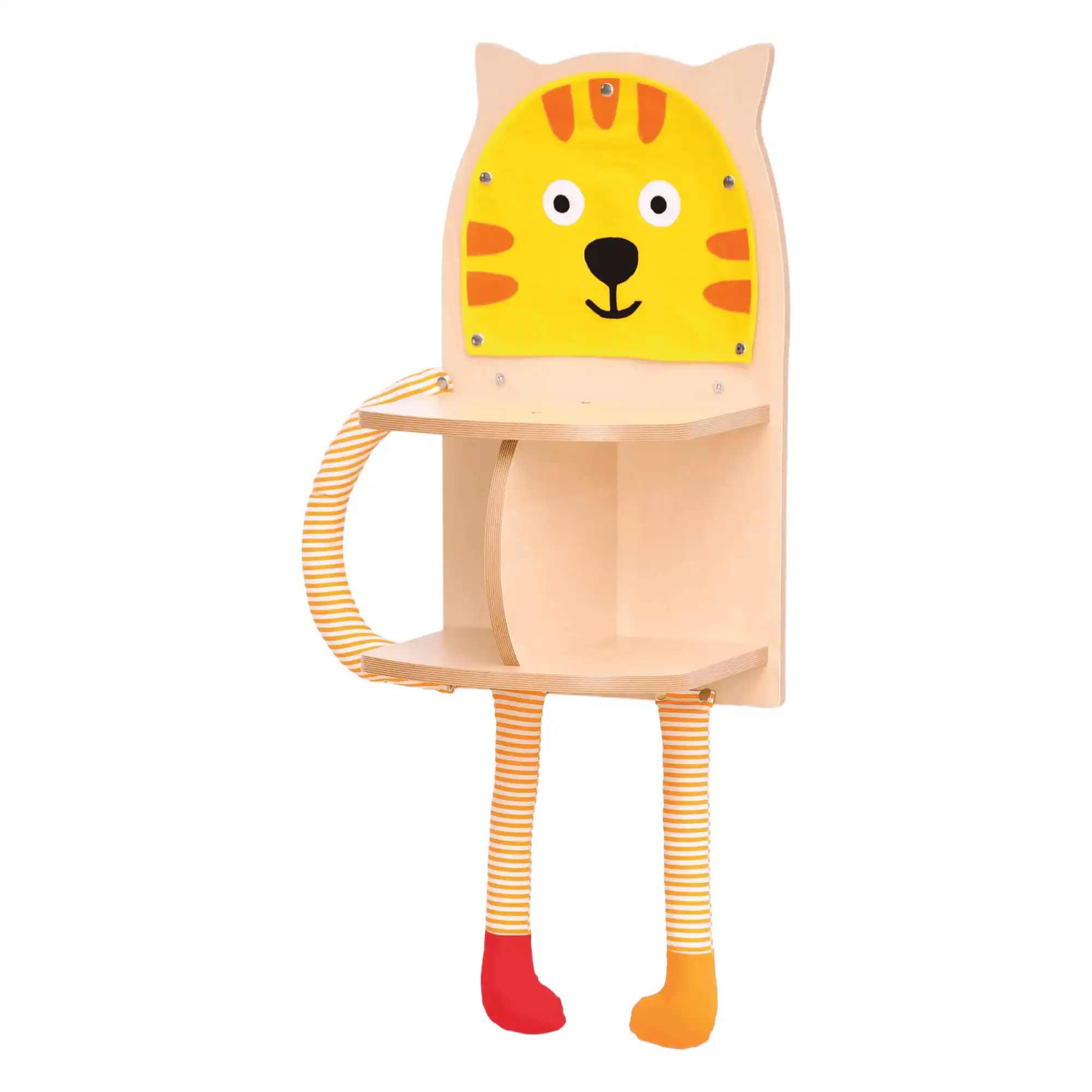Two-level shelf, which imitates a cat. Made of laminated chipboard. Colorful legs and tail made of soft fabric make the shelf more attractive. To hang on the wall.
