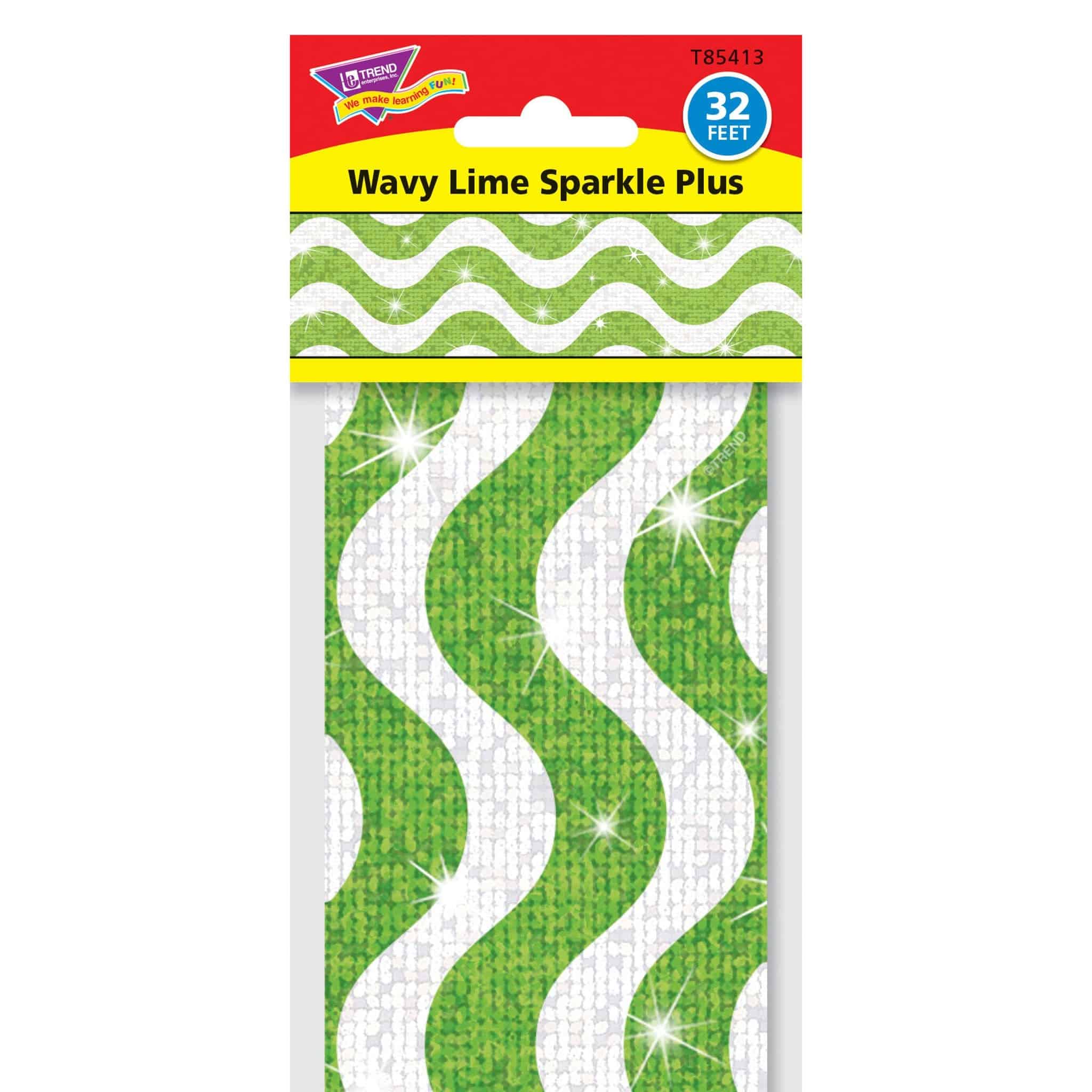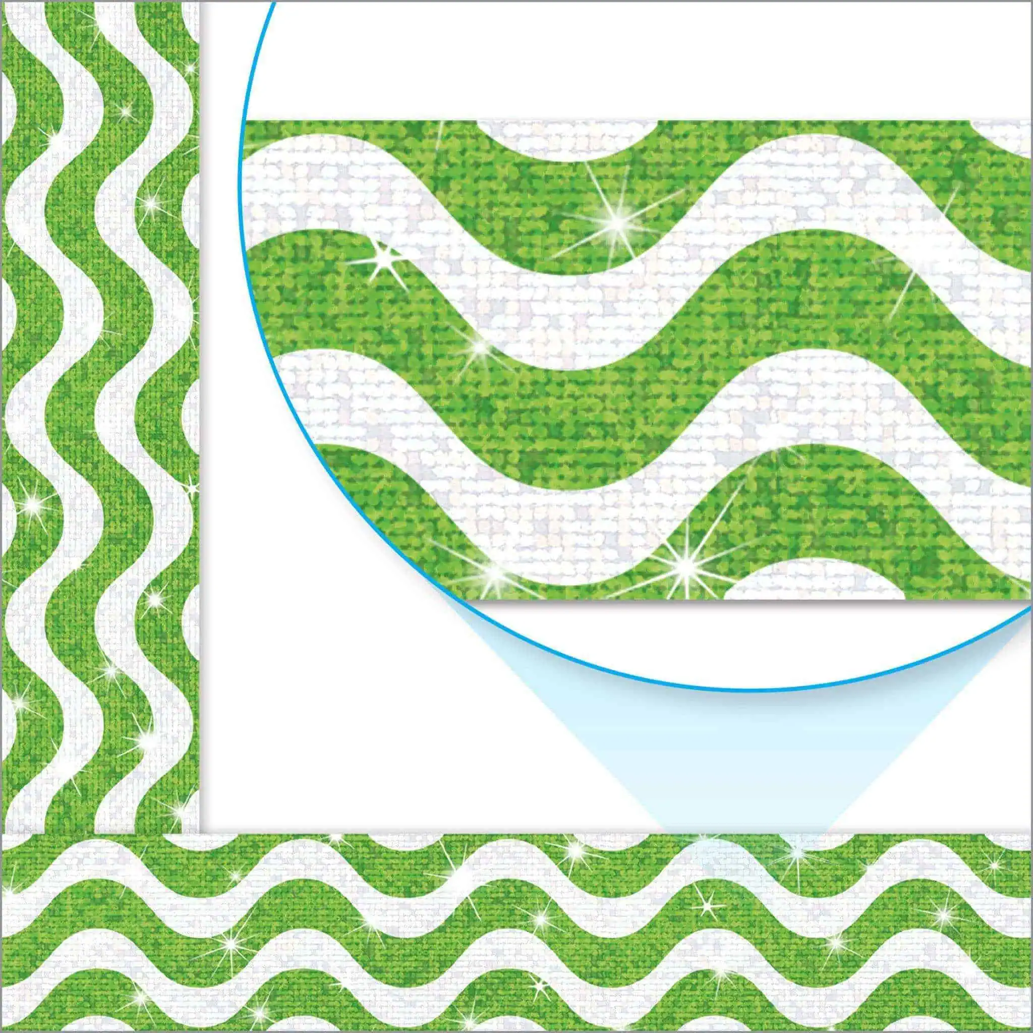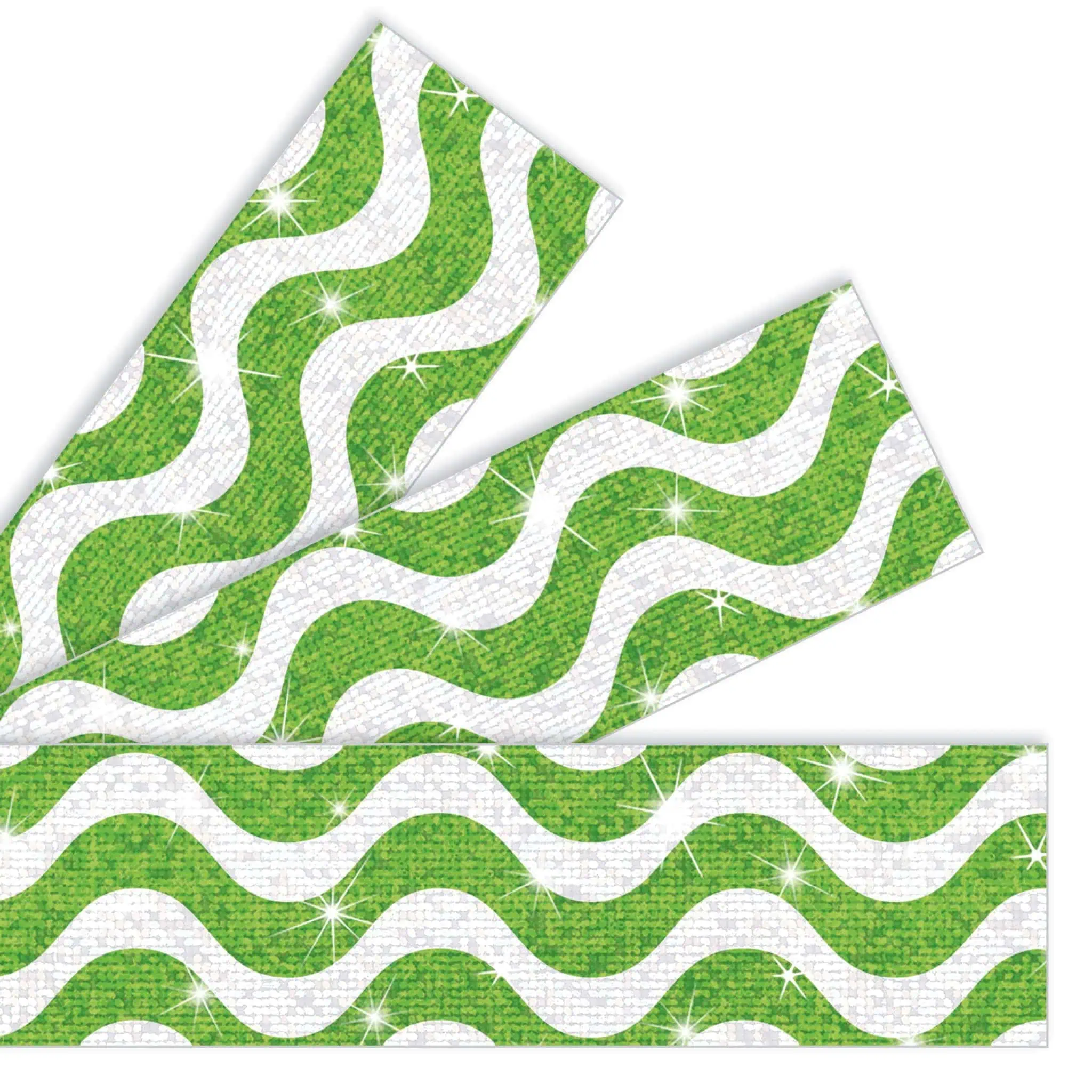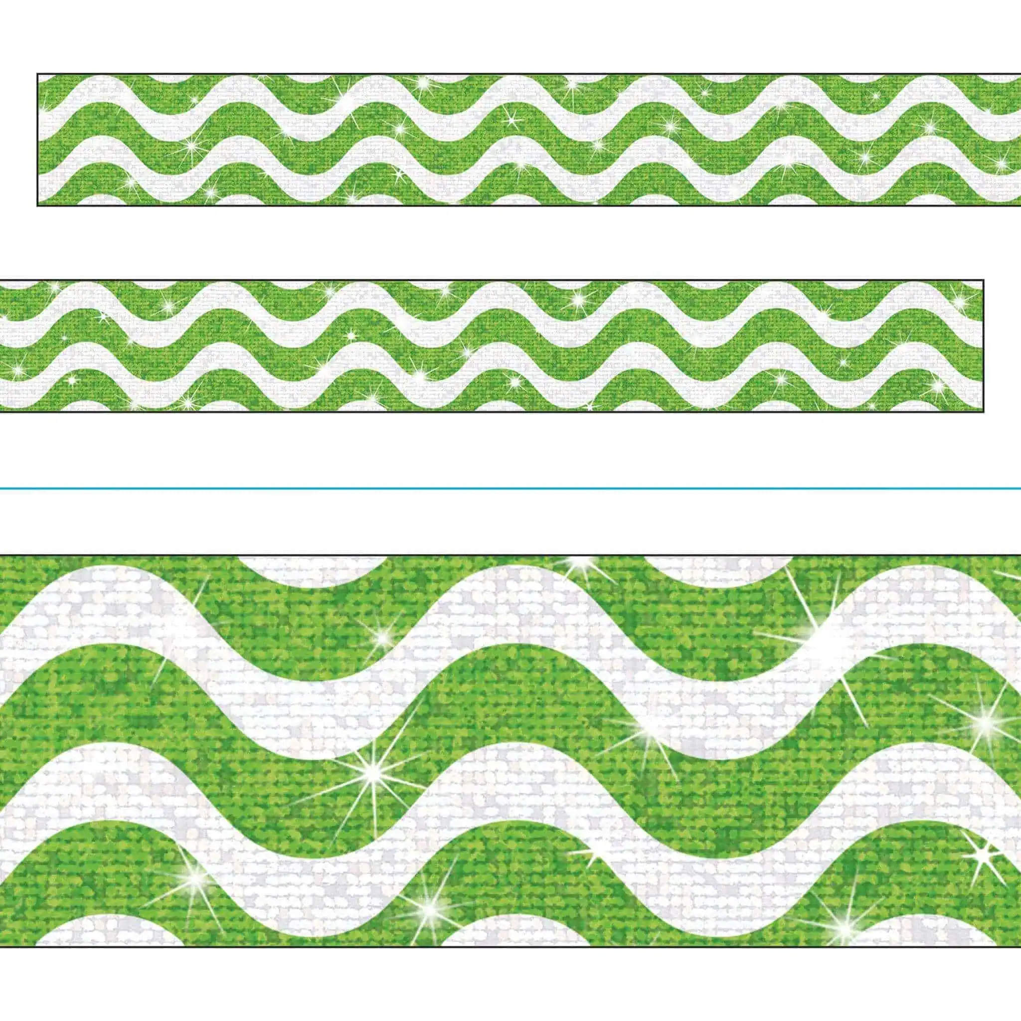 Add a special touch to displays with rich sparkle borders. Straight-edge design fits easily into any space. Layer with patterned borders for an eye-catching look. 2 3/4” x 32 1/2′ per pack; 10 strips. Precut, durable, reusable.