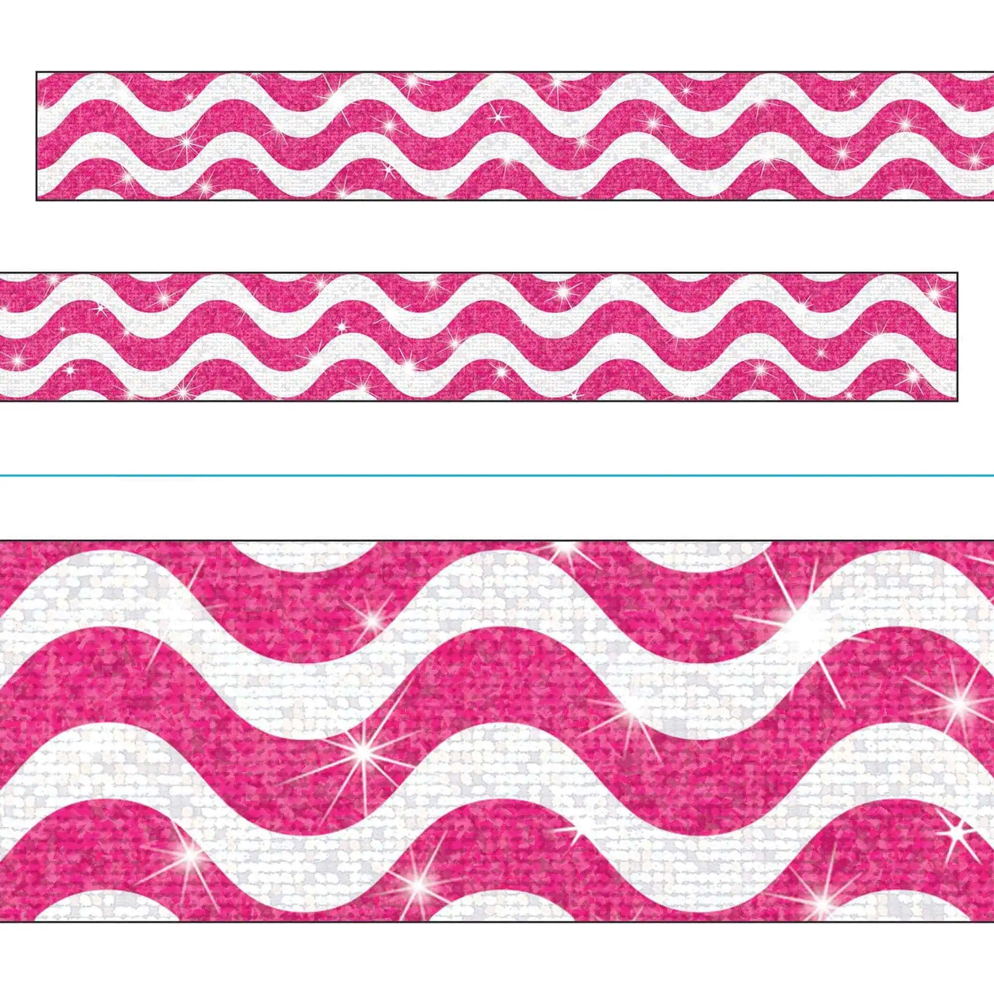 Add a special touch to displays with rich sparkle borders. Straight-edge design fits easily into any space. Layer with patterned borders for an eye-catching look. 2 3/4” x 32 1/2′ per pack; 10 strips. Precut, durable, reusable.